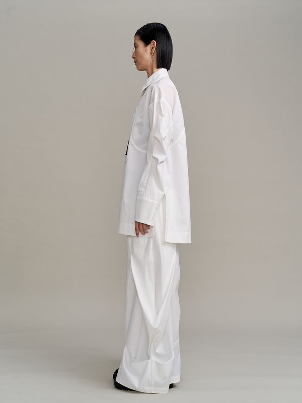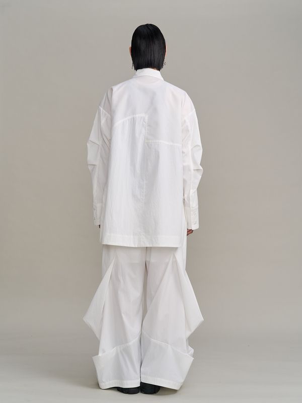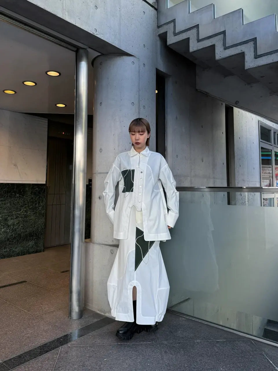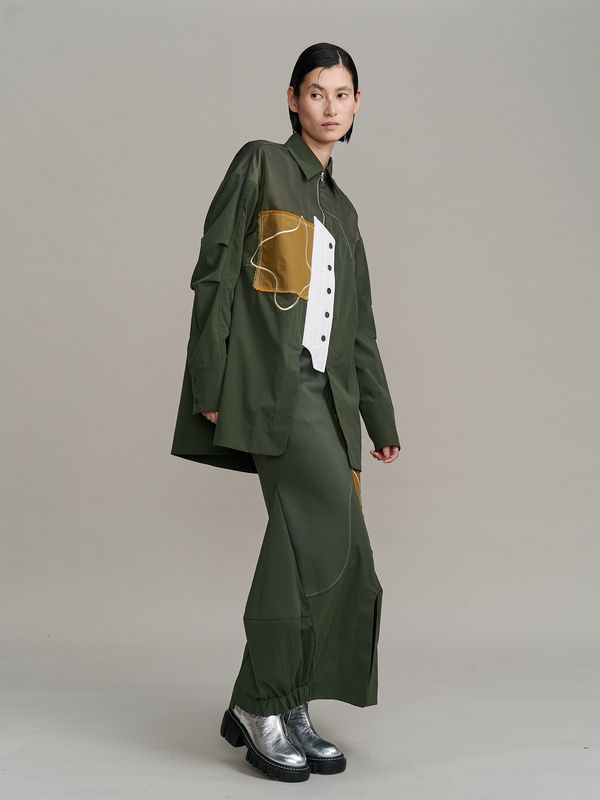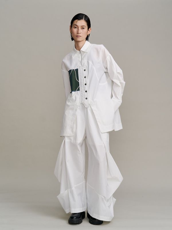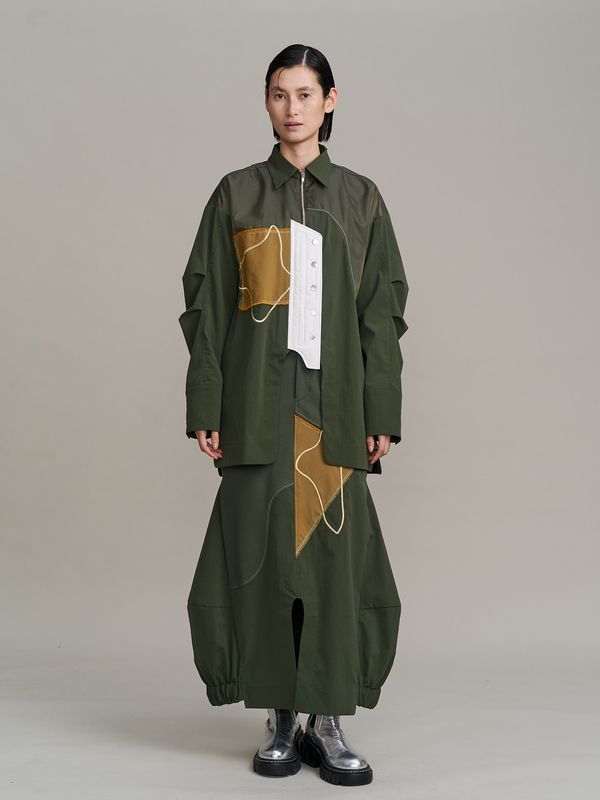 面料上特別結合了多種異材質拼接,讓單一色調中也能透出豐富的肌理層次,立體剪裁讓線條看起來很俐落。