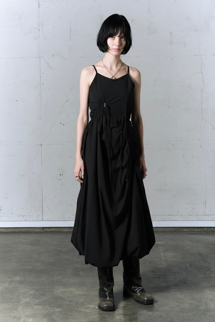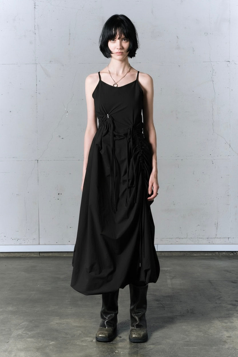 最特別的是身側延伸出的同材質織帶,你可以隨意拉動、抽褶,原本平整的洋裝就會立刻變成立體、有層次的樣子。