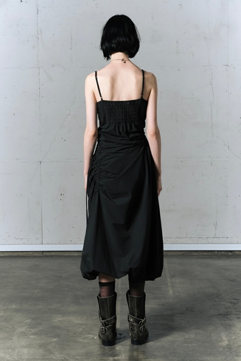 下襬處刻意保留了圓潤的空氣感,走動時裙擺會自然晃動,帶出一種很漂亮的垂墜線條。這件洋裝結合了機能材質與有趣的結構變化,不只是好穿,更是一件讓你能在日常中玩出不同線條的實驗性單品。