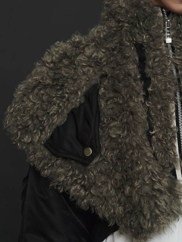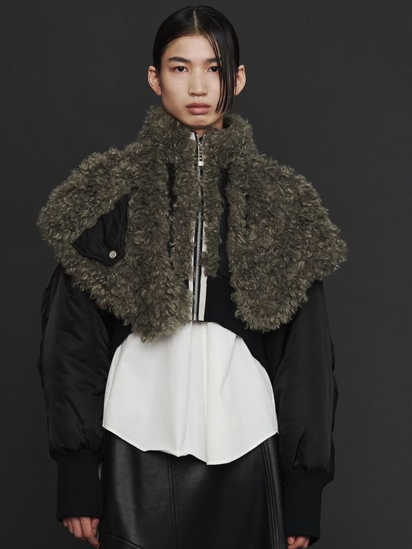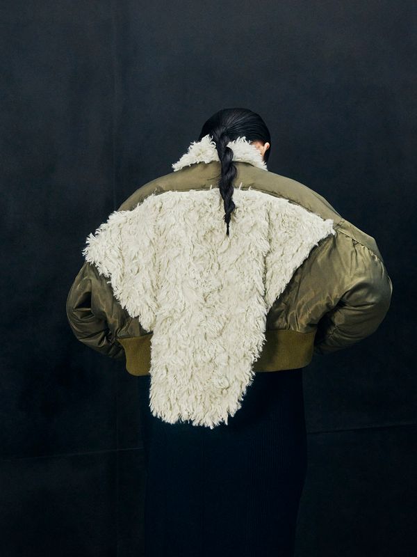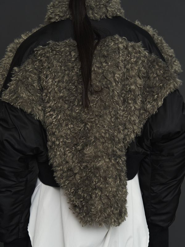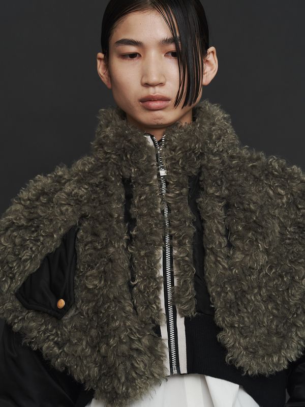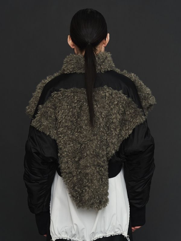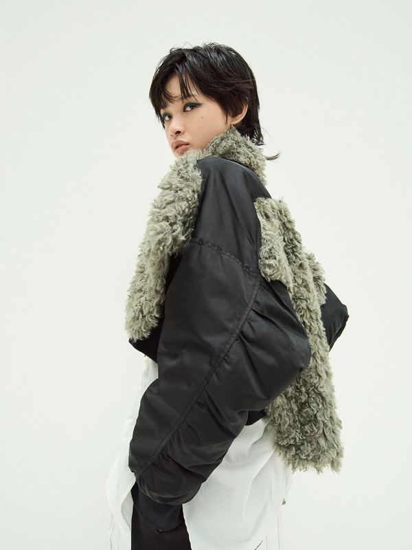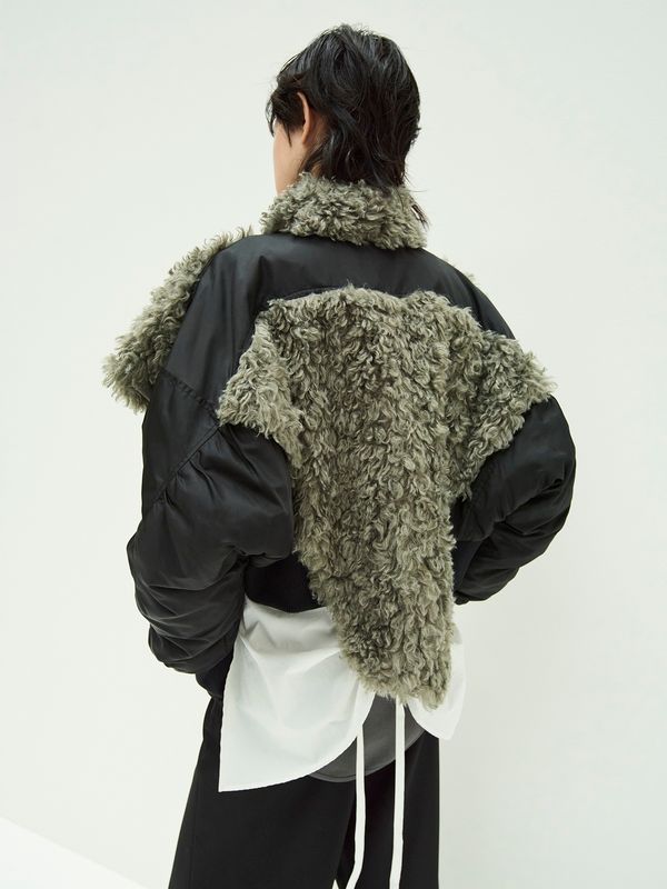 將 MA-1 的俐落輪廓與蓬鬆毛絨拼接出全新比例。
