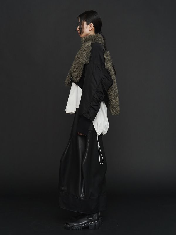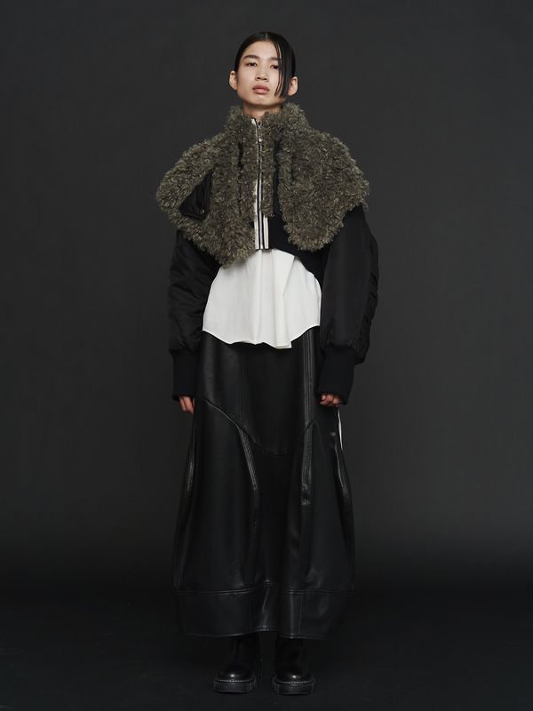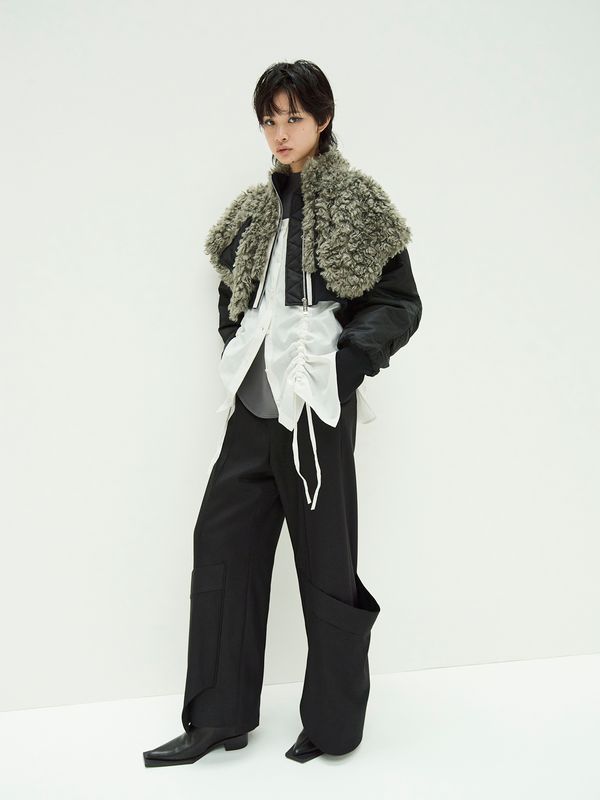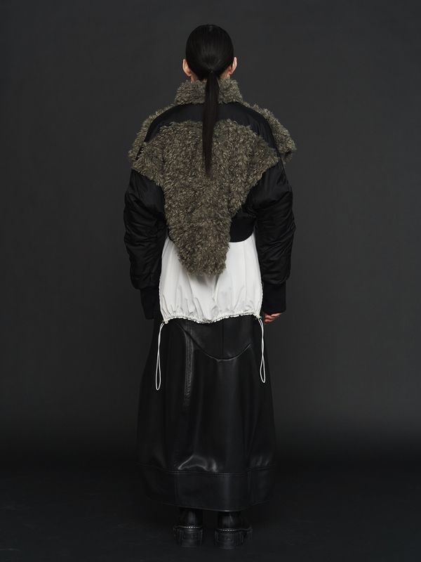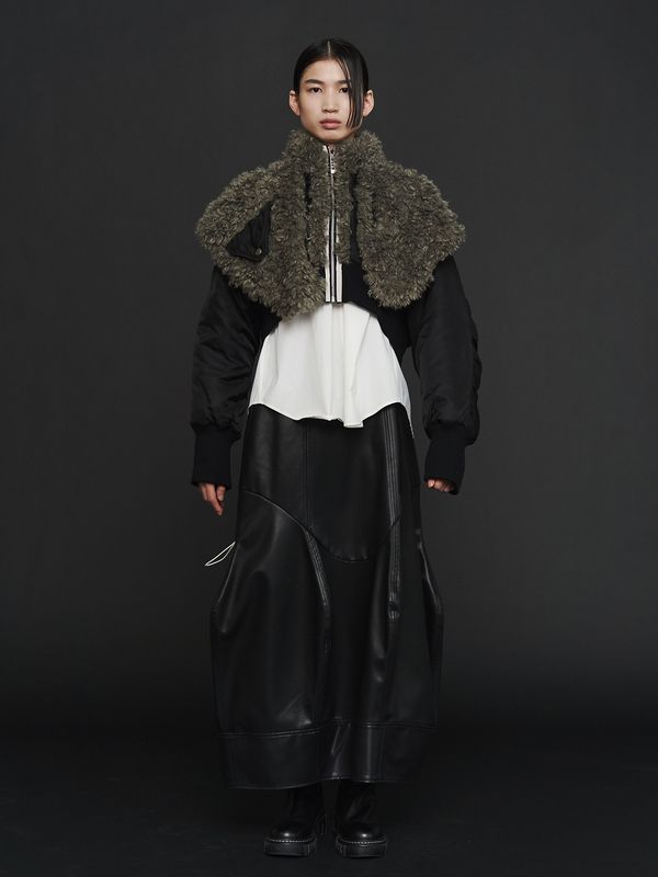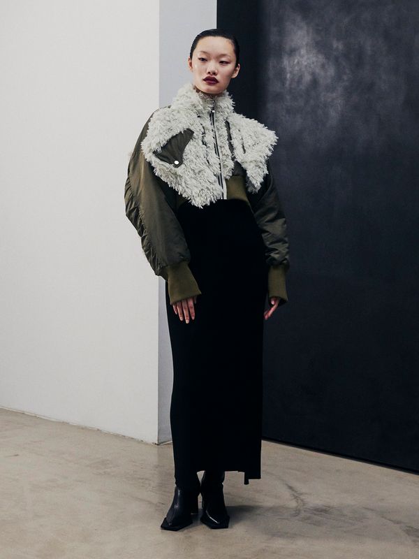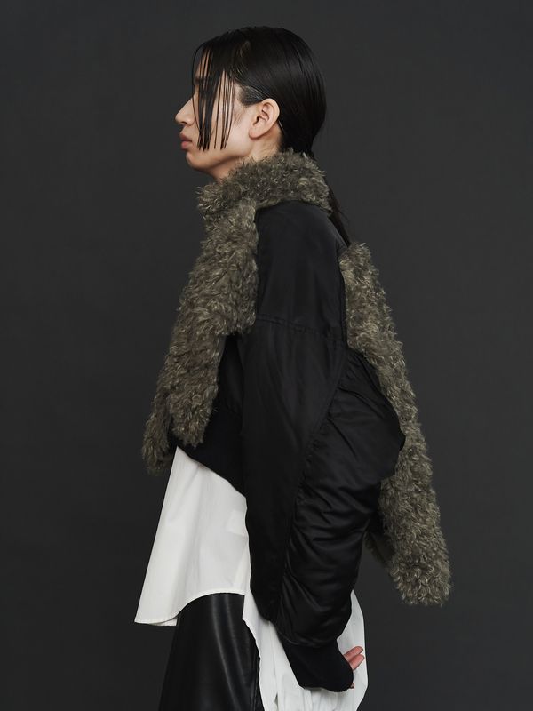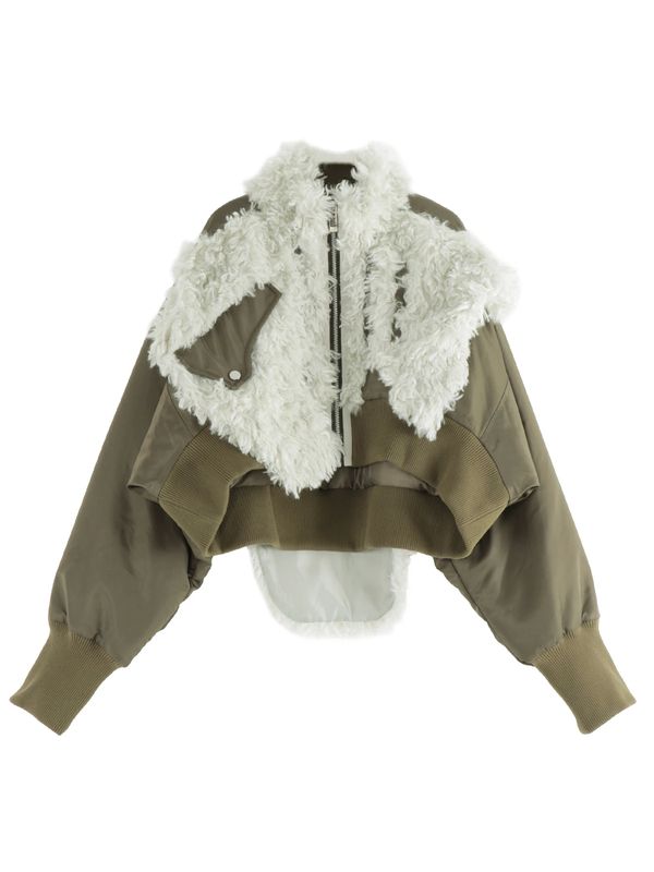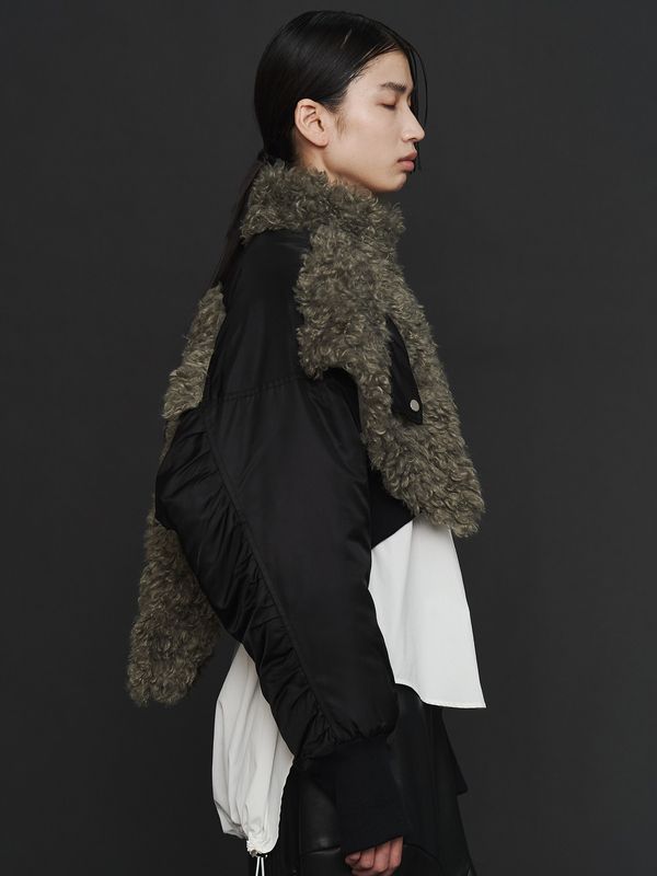 將 MA-1 的俐落輪廓與蓬鬆毛絨拼接出全新比例。