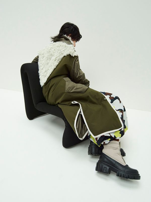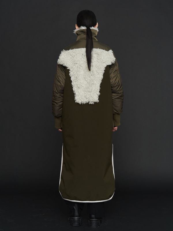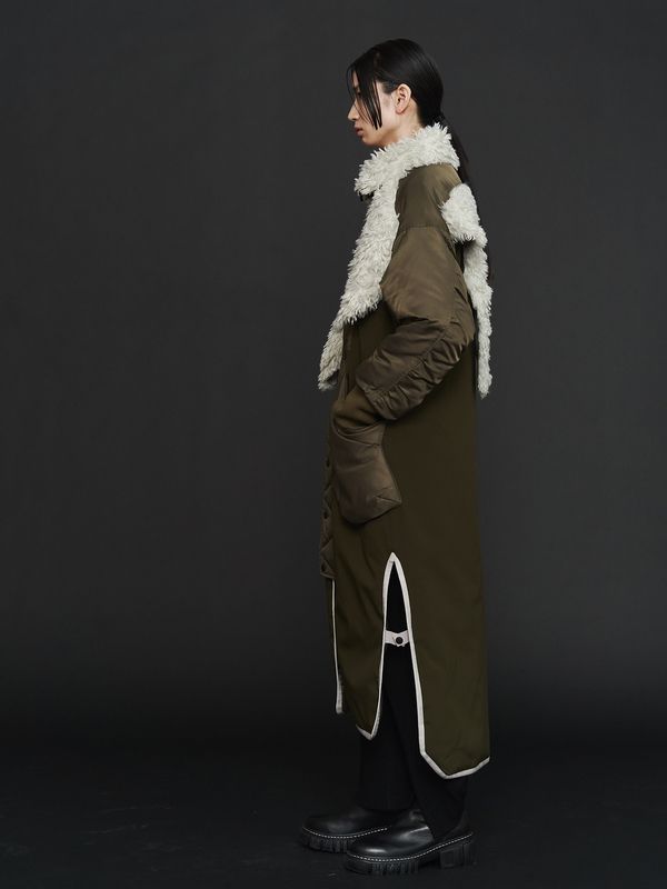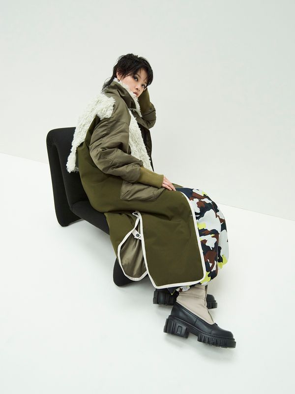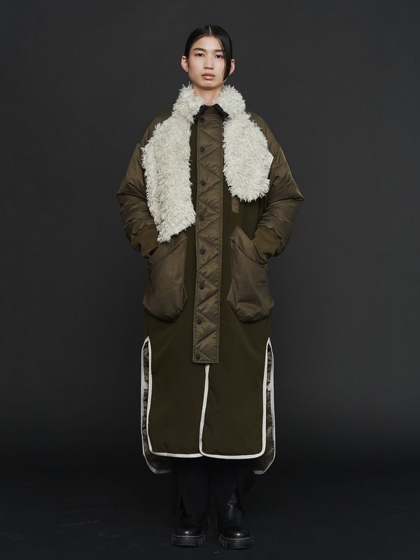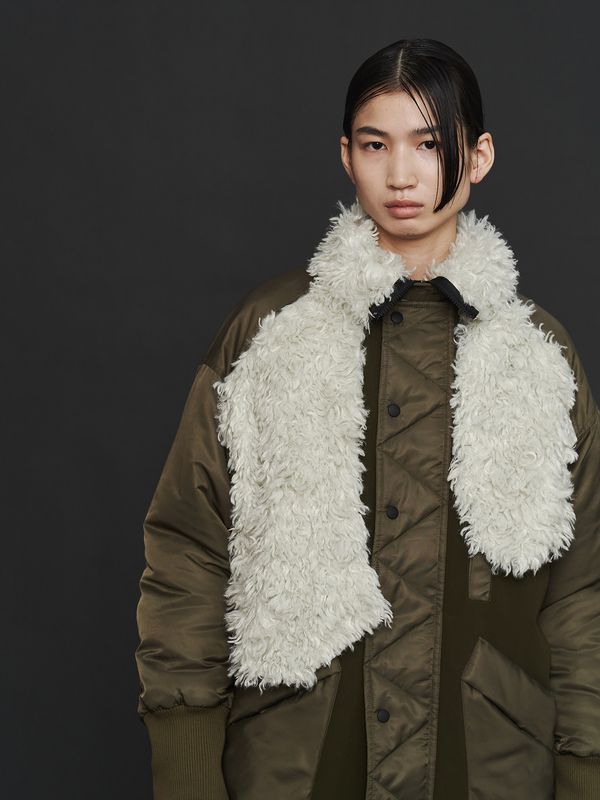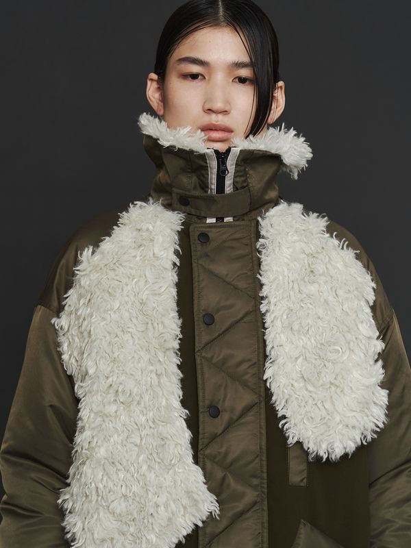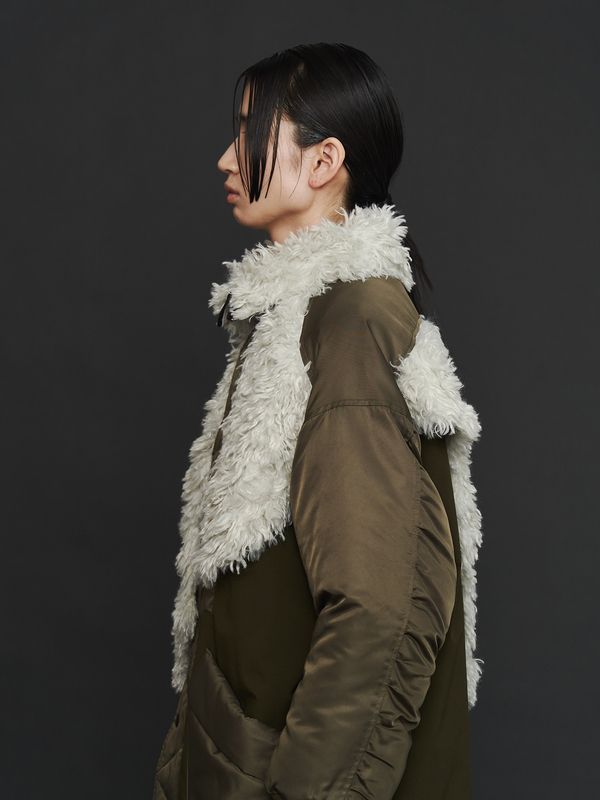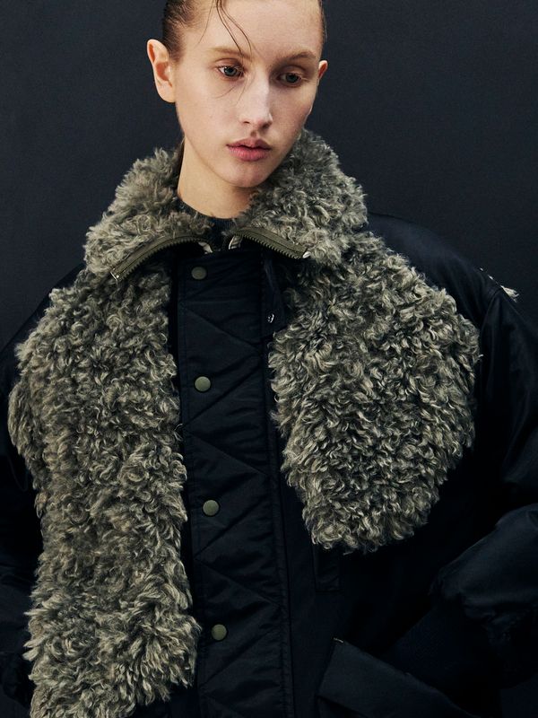 毛面的柔軟與軍裝元素重疊,形成獨有的份量與存在感。長毛絨的觸感輕柔,蓬度自然,像是蓄著暖空氣般包覆肩膀與上背,保暖卻不沉重。拉鍊拉到最上端時能包覆到頸部,在濕冷天氣裡也能維持舒適。