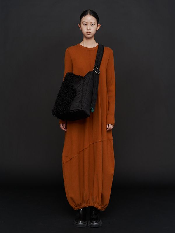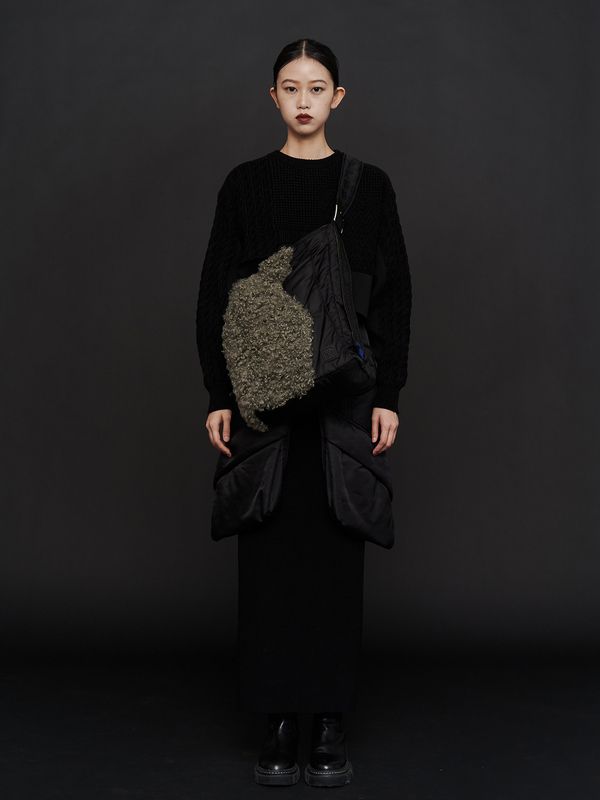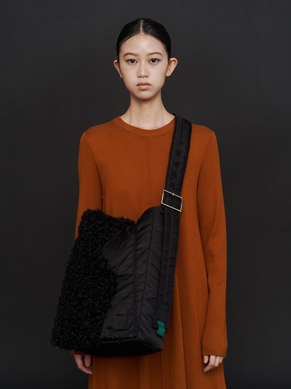 以蓬鬆毛絨和 MA-1 系列使用的挺度尼龍布料拼接而成,視覺上帶著柔軟與俐落的反差,獨特的波浪切線讓包身在簡潔中多了一點律動感,是遠看就能感受到 UN3D. 個性的托特包。