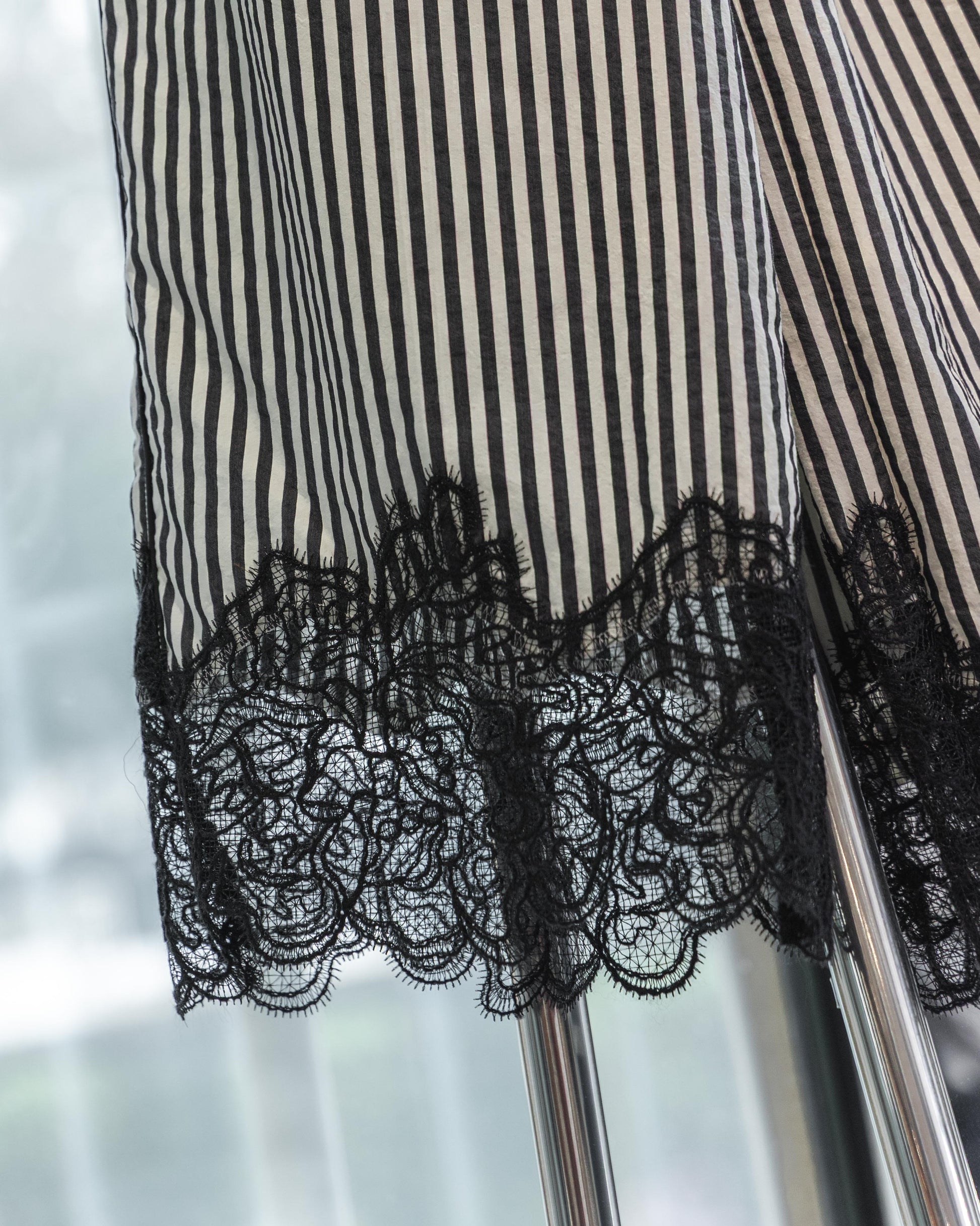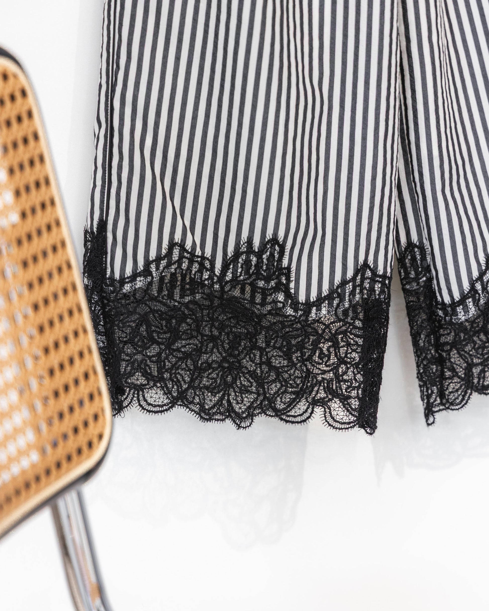 將內斂的霧面光澤與高級觸感完美揉合,選用帶有挺度的混紡棉料,讓絲綢般的垂墜感中透出一份洗鍊。褲腳精緻的蕾絲飾邊是視覺的靈魂,讓原本慵懶的剪裁瞬間染上奢華氣息,這份細節不僅打破了日常穿搭的單調,更是在正式社交場合展現品味的秘密武器。
