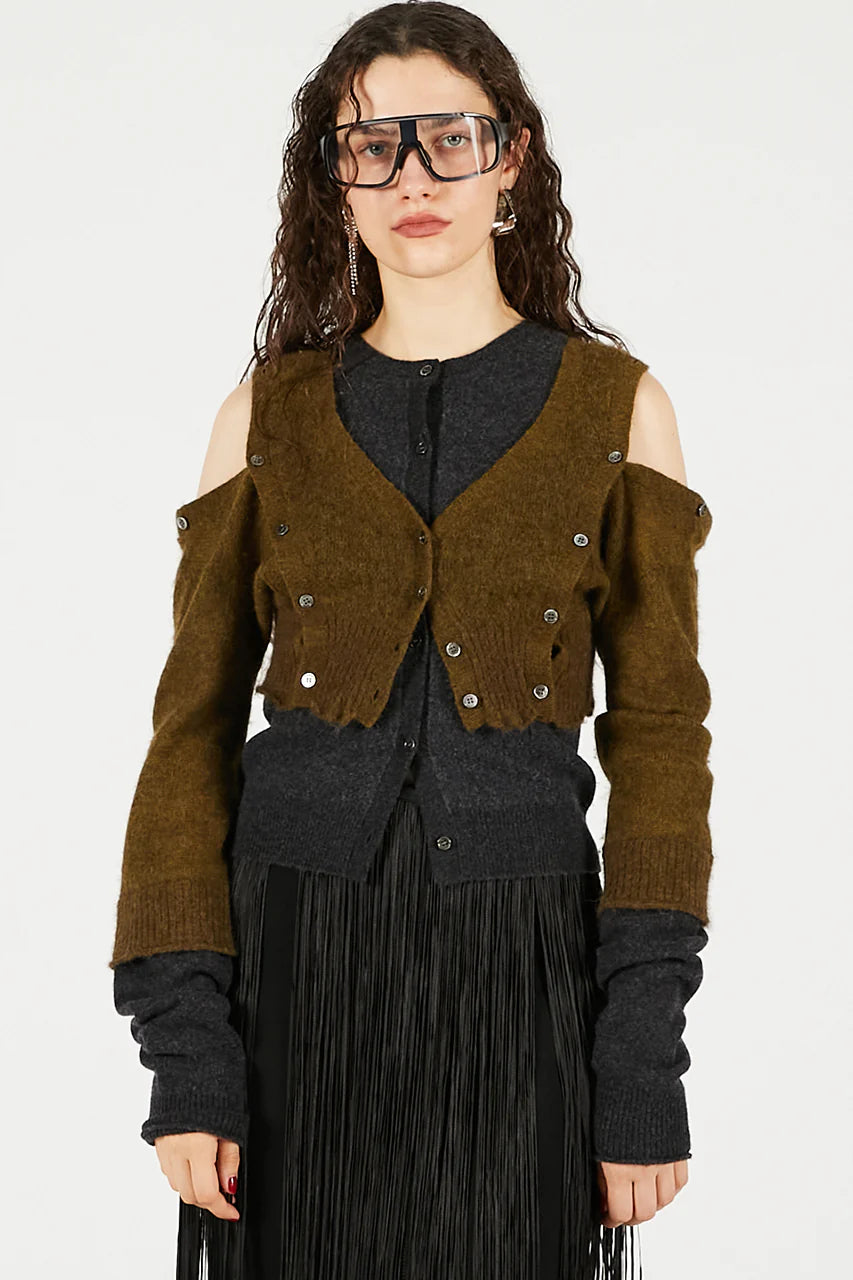 毛衣與背心的疊穿組合,粗針編織的毛衣與細針背心形成鮮明對比,釦子可自由開合,輕鬆變換穿法,前後皆可穿著,