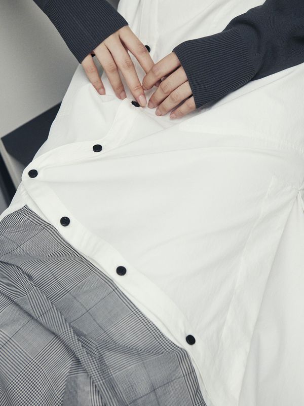 將透膚格紋與柔滑條紋面料巧妙拼接,展現細膩層次感。衣身採用 UN3D. 經典材質,輕盈易整理,穿著舒適自在,適合日常或特別場合。