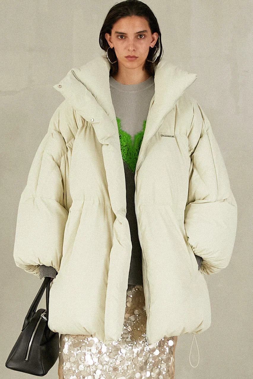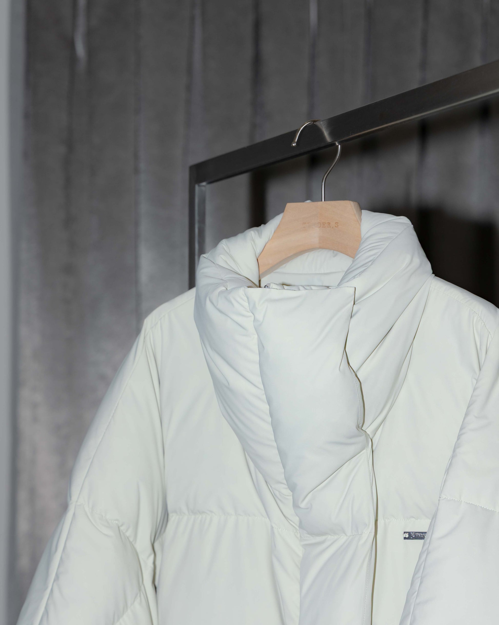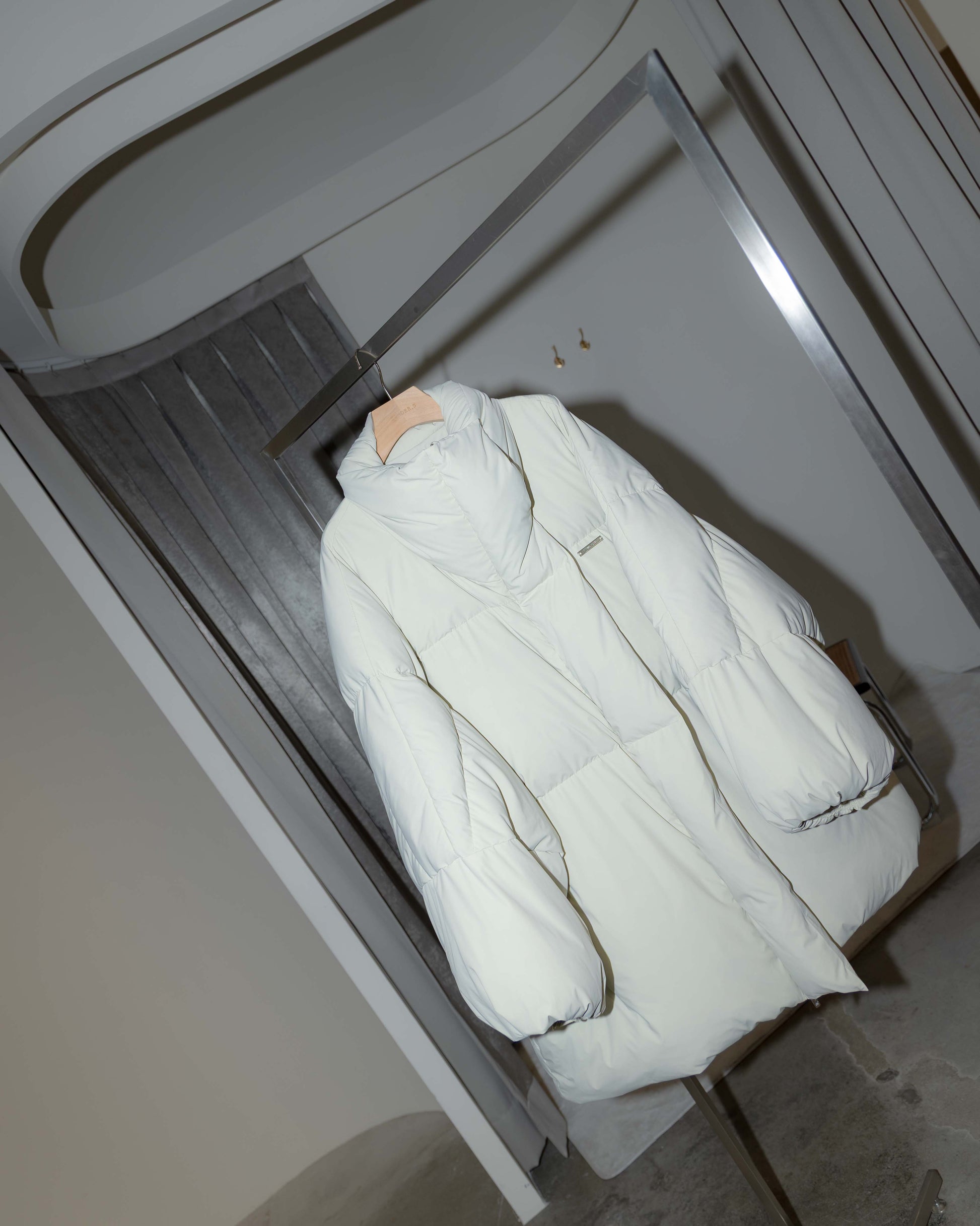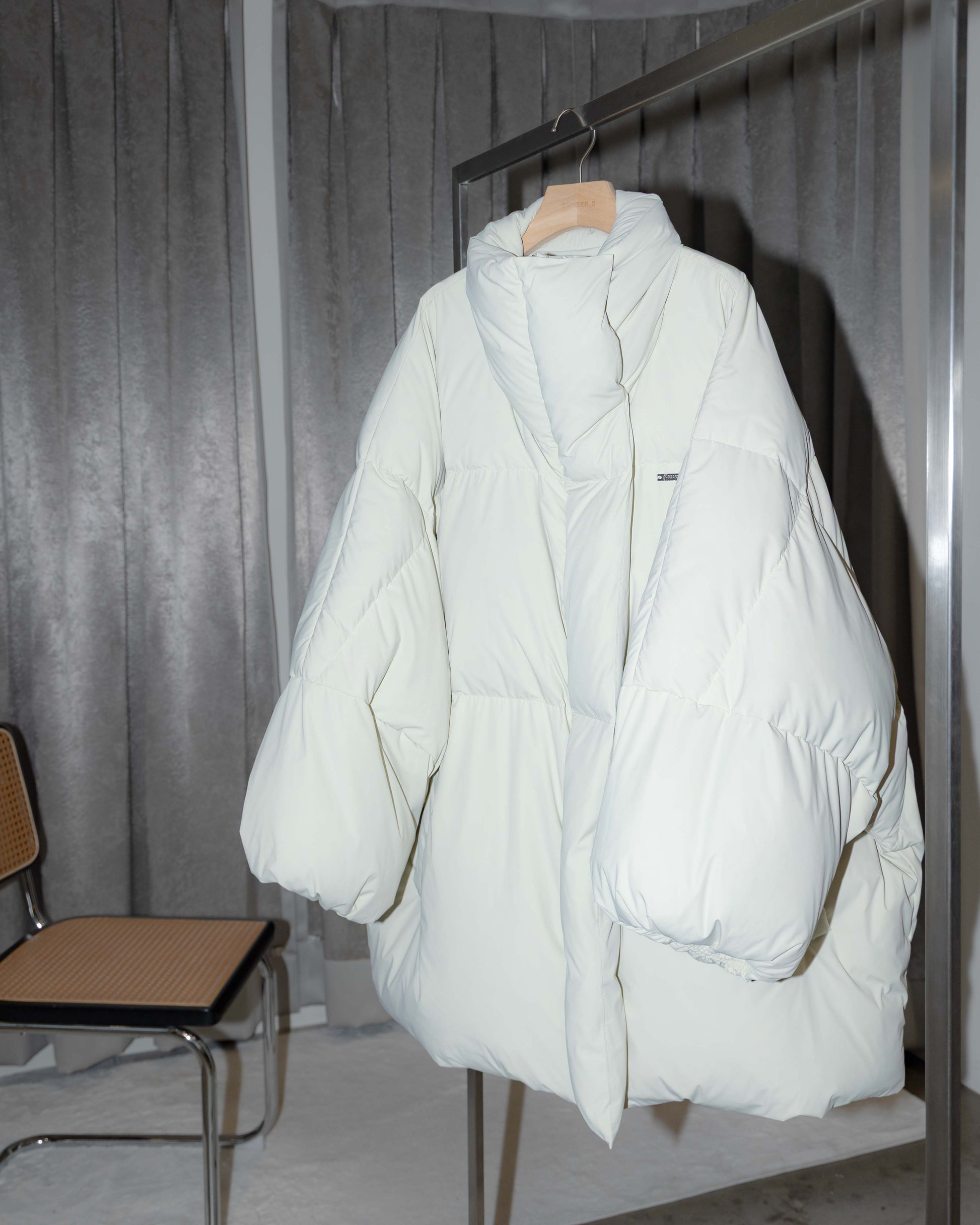 A字剪裁的斗篷式羽絨外套以包覆感十足的寬鬆輪廓呈現,穿上後能感受到輕柔的包裹與安定的溫度。