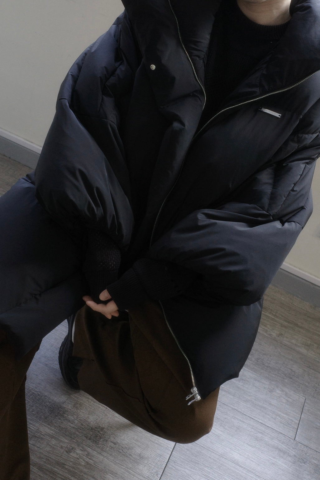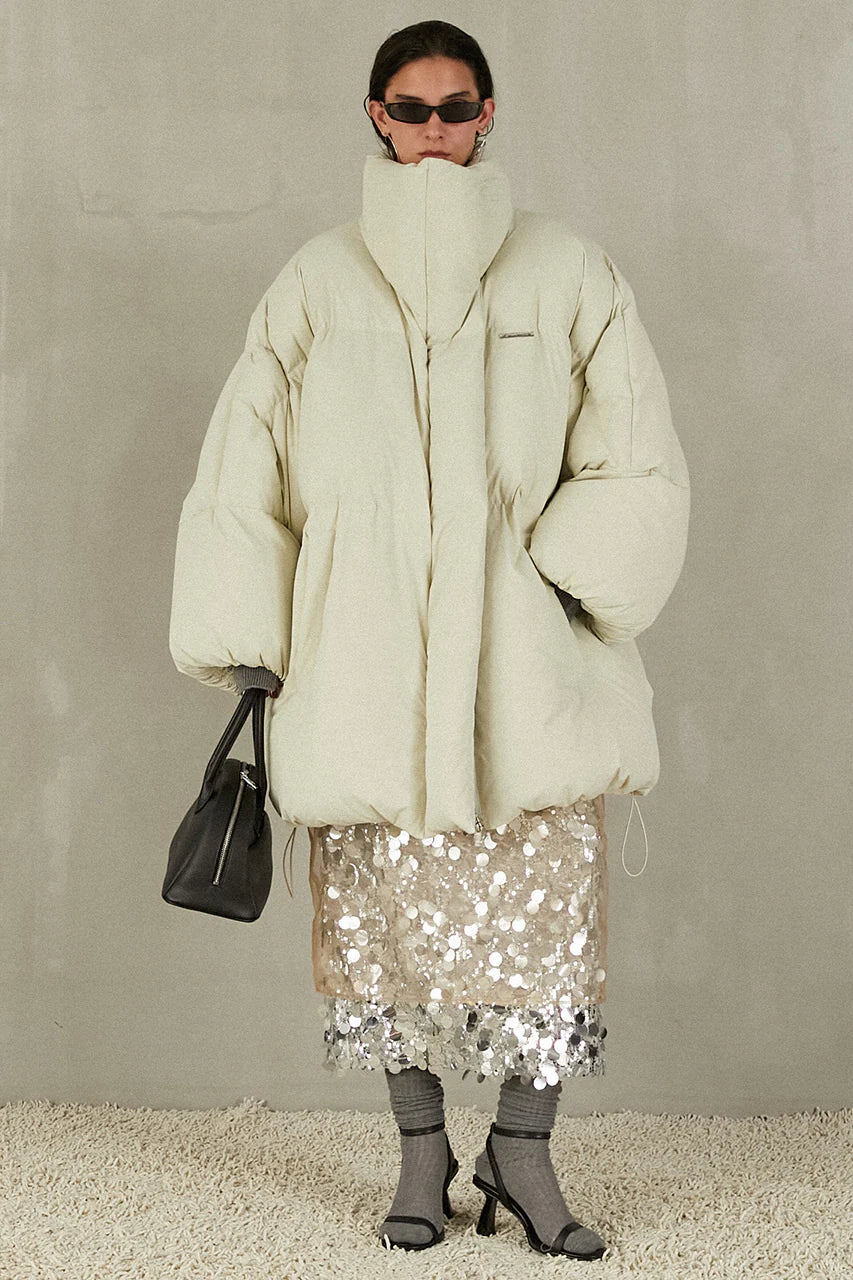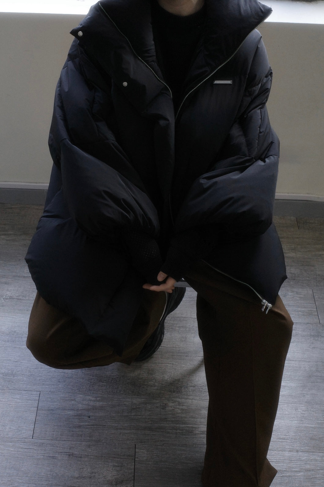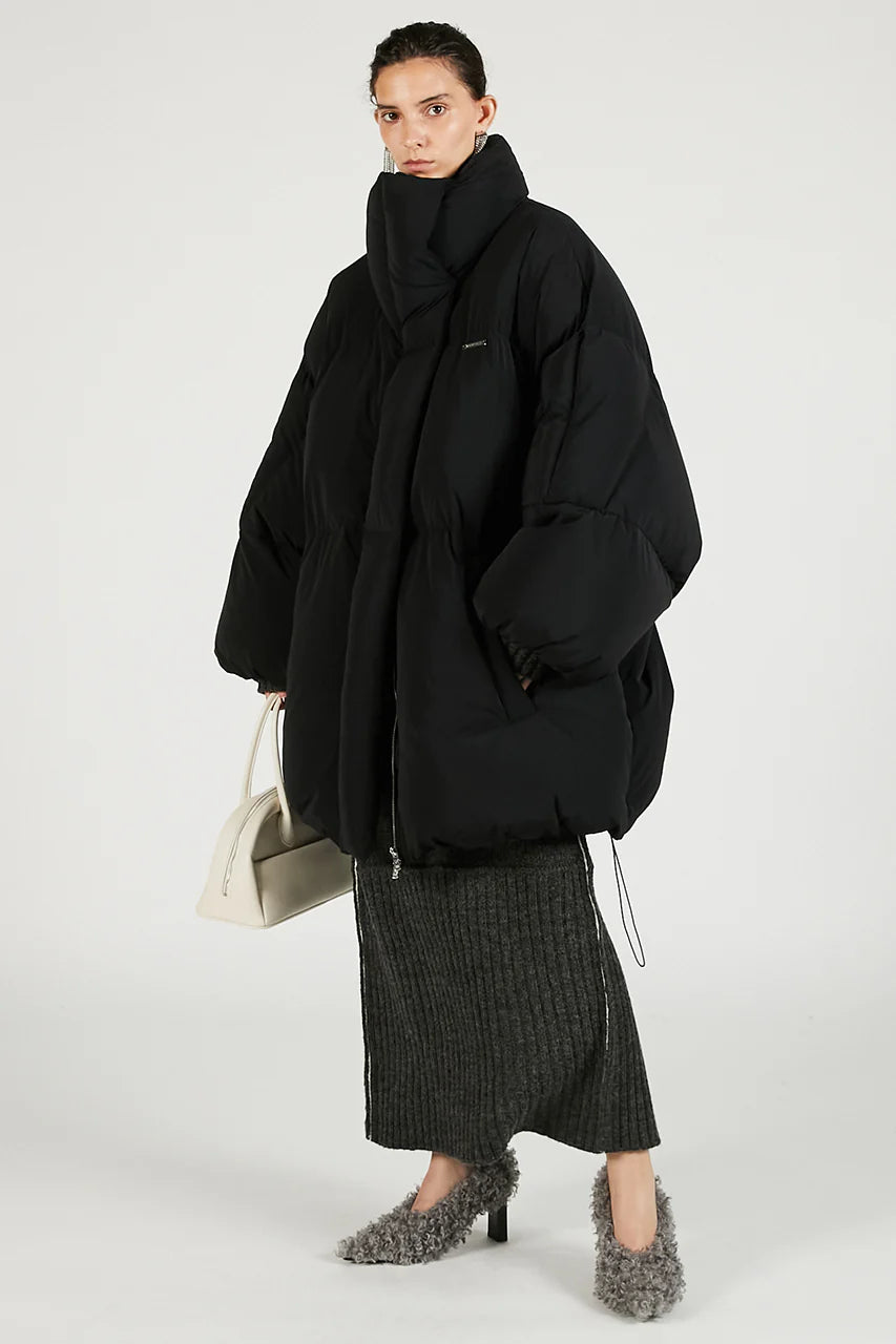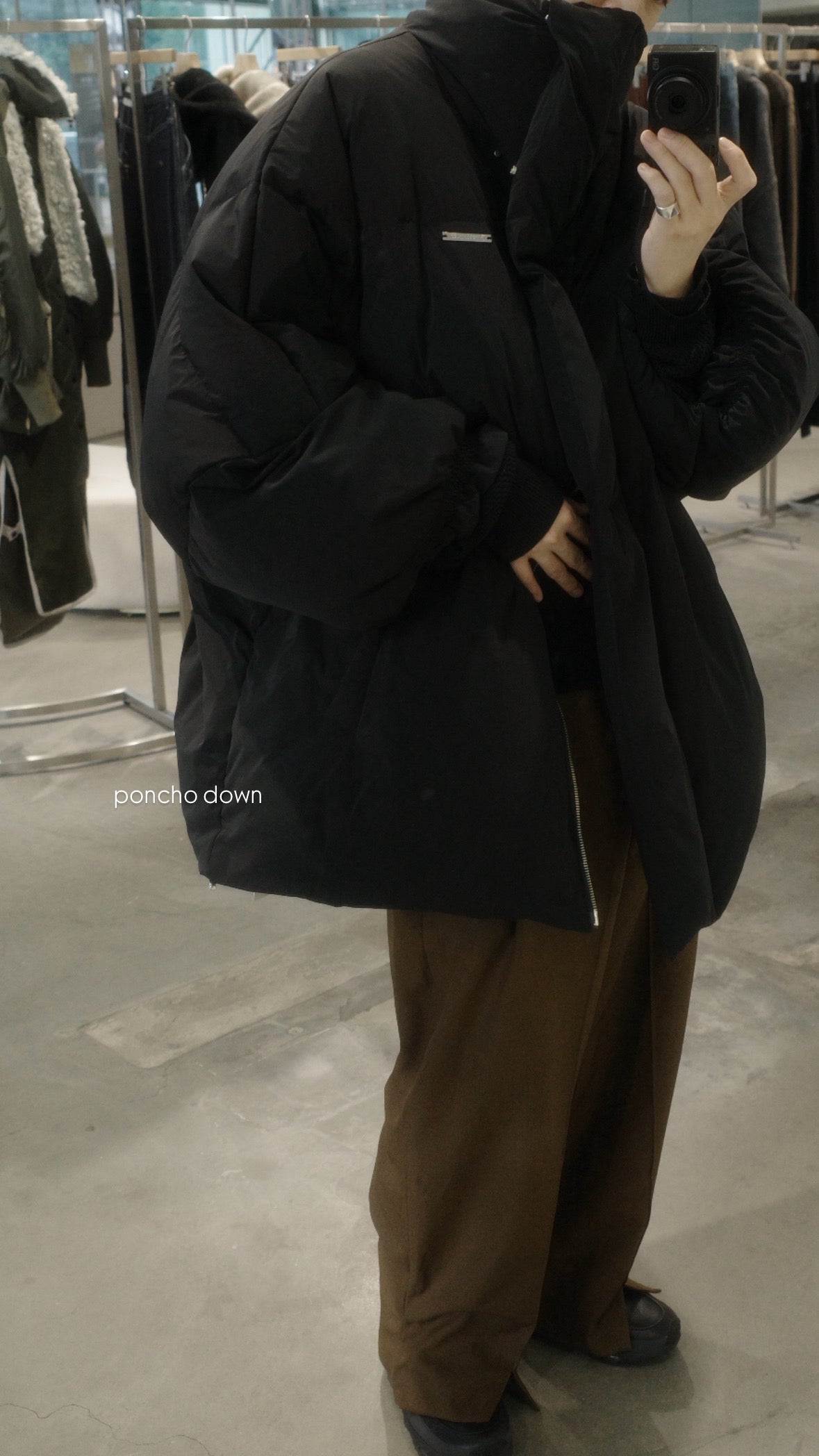 A字剪裁的斗篷式羽絨外套以包覆感十足的寬鬆輪廓呈現,穿上後能感受到輕柔的包裹與安定的溫度。