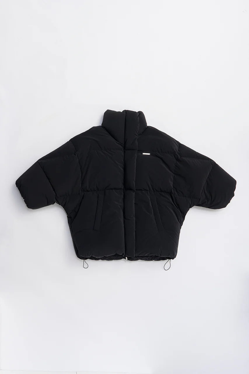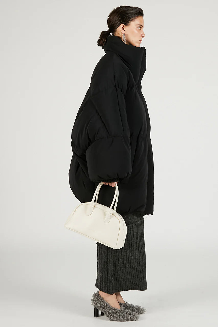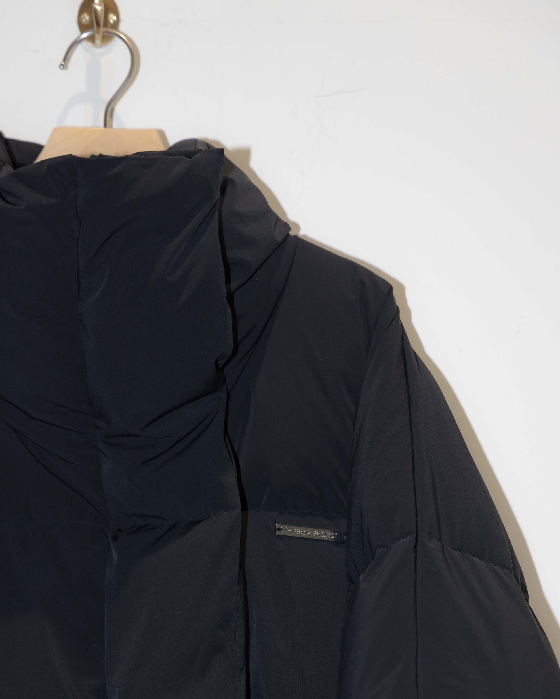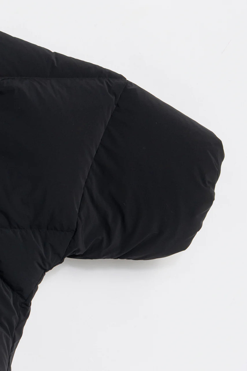 A字剪裁的斗篷式羽絨外套以包覆感十足的寬鬆輪廓呈現,穿上後能感受到輕柔的包裹與安定的溫度。