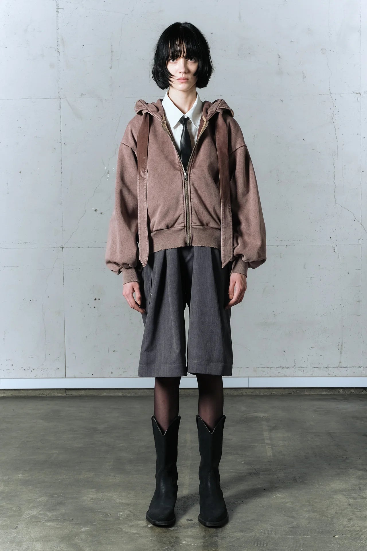 立體感十足的大連帽外套,融合了軍裝的帥氣與女性的柔和。取代抽繩的寬綁帶 光是垂放就能瞬間修飾肩頸線條。
