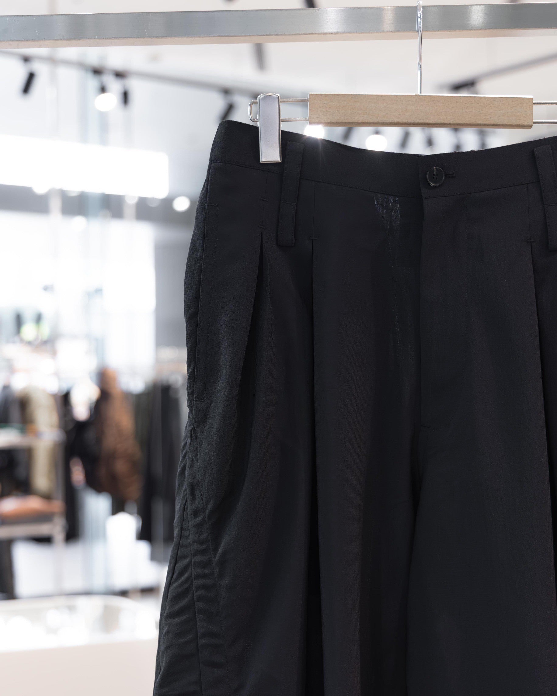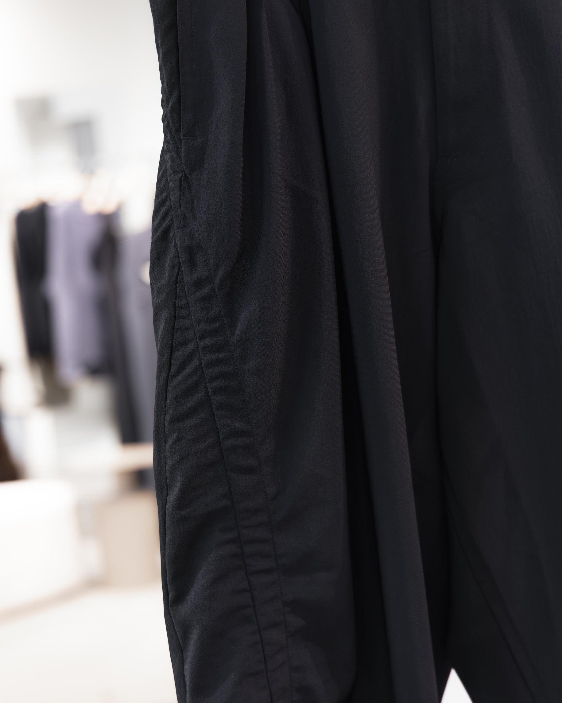 最具巧思的細節藏在斜向的剪裁切線裡。在縫線內側嵌入了棉質織帶,刻意營造出微小的自然抓皺,為褲身平整的表面增添了豐富的視覺層次與職人手感。