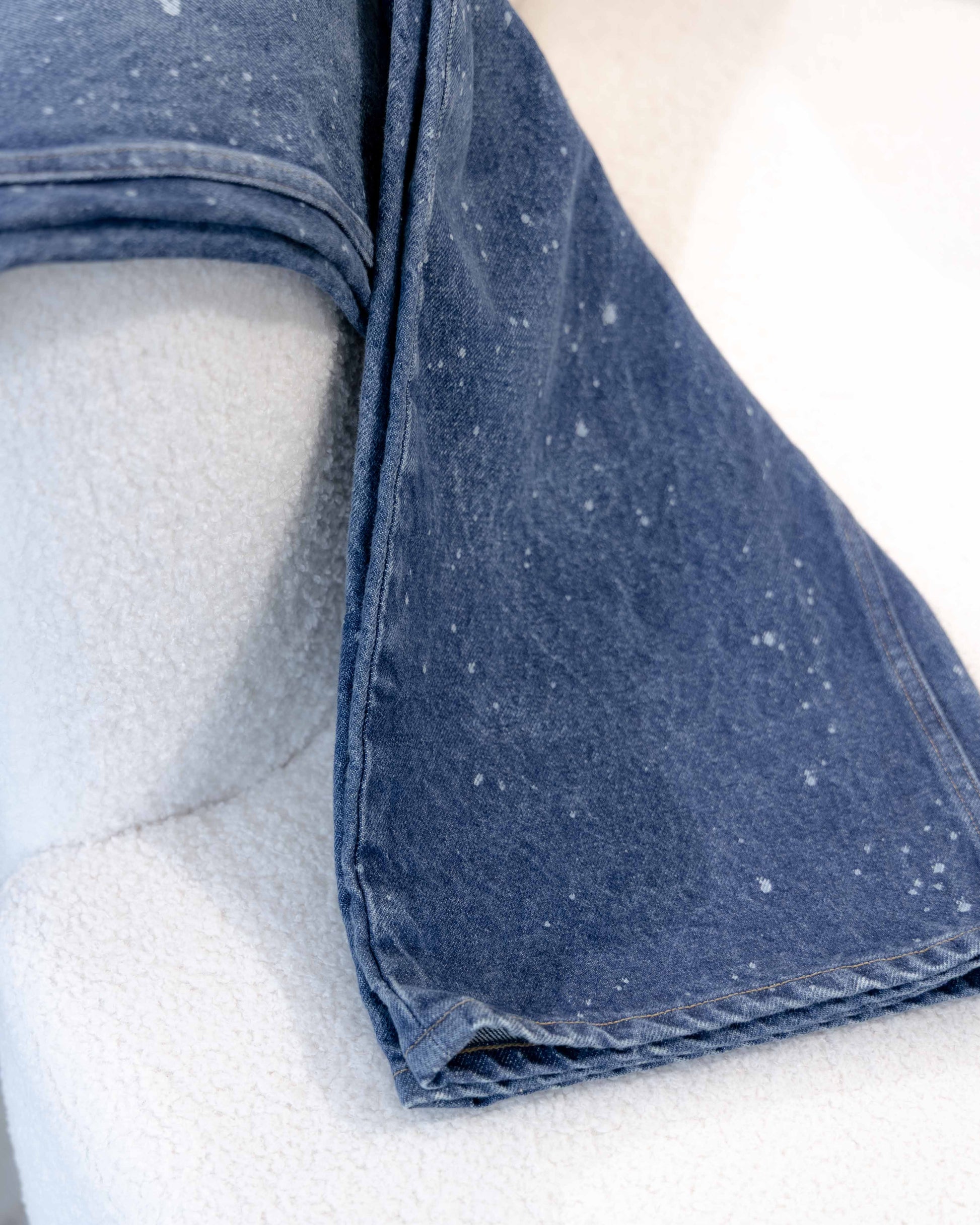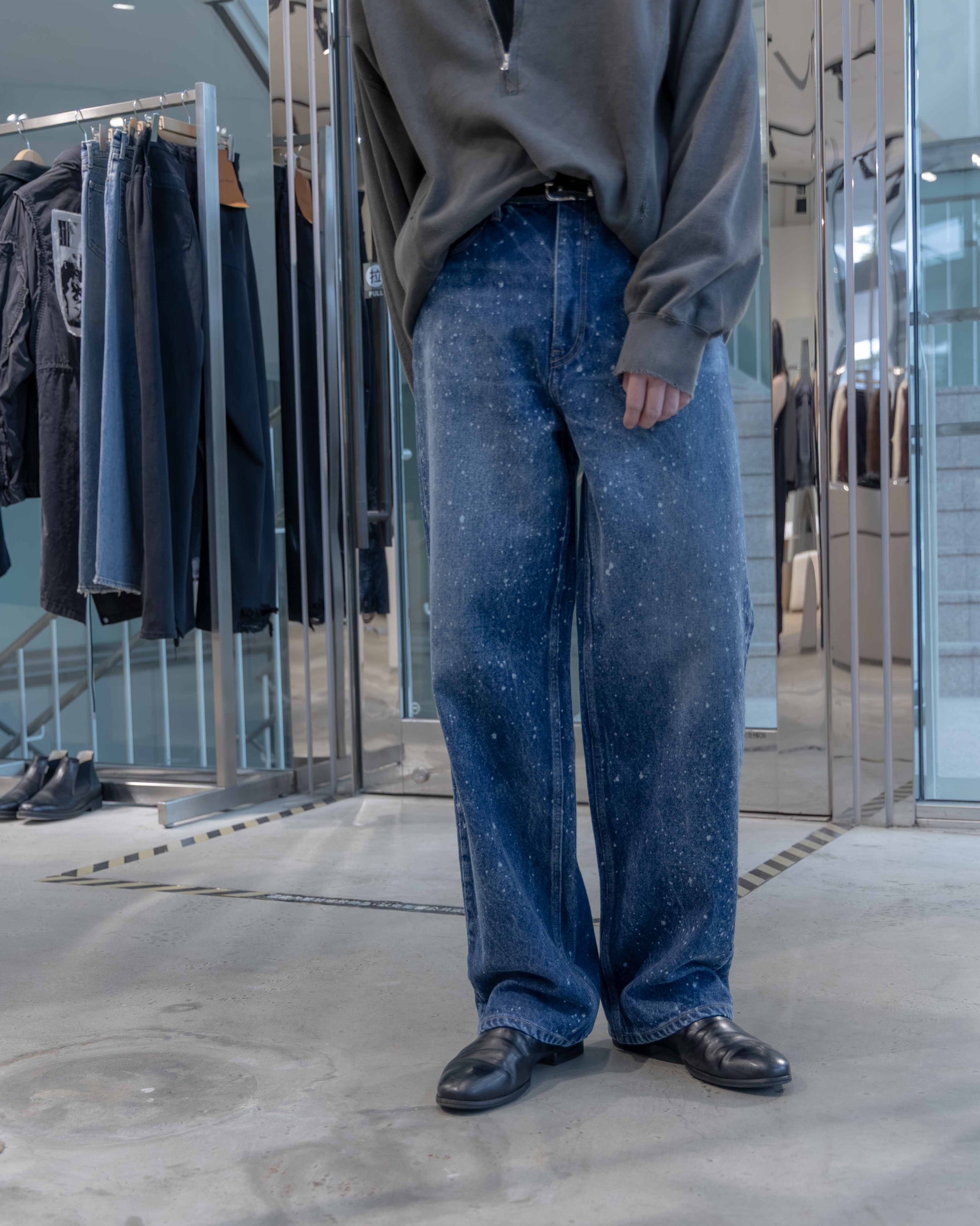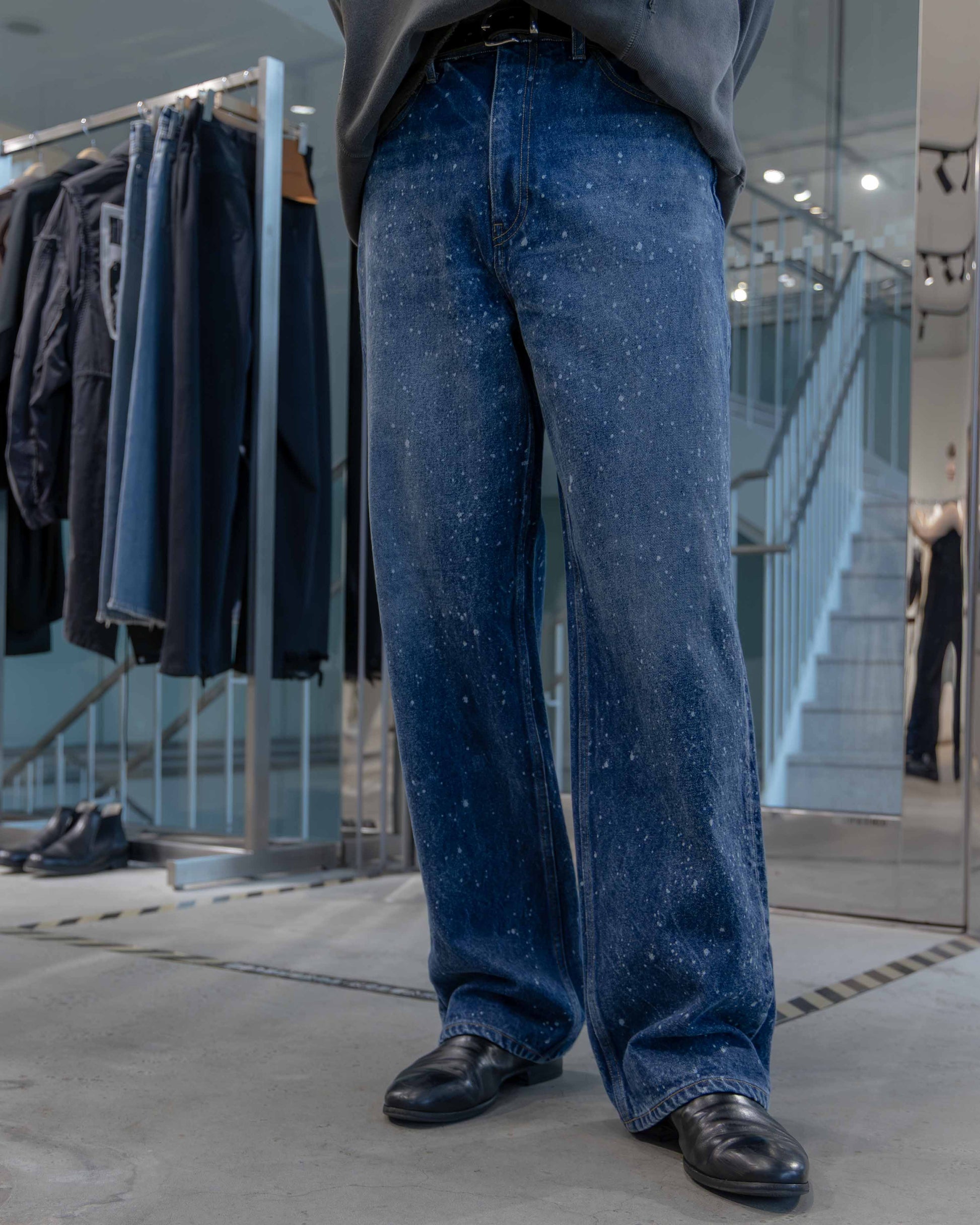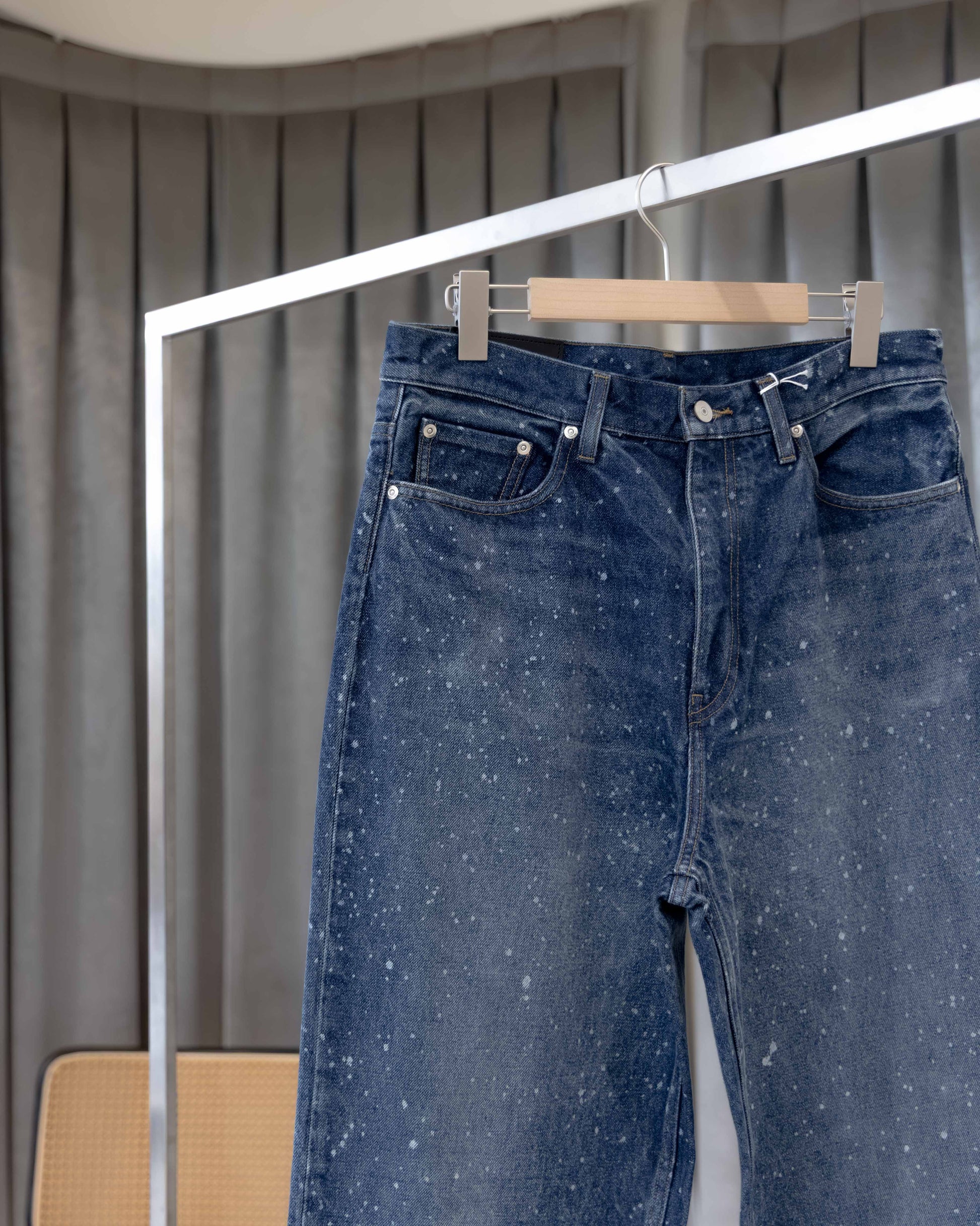 藍色款以經典丹寧藍為基底,透過特殊漂洗與潑染處理,營造出如細碎光點般的層次變化。表面呈現自然的刷痕與深淺不一的色澤,讓每件褲子的紋理都略有不同,像是長時間穿著後才會出現的獨特痕跡。