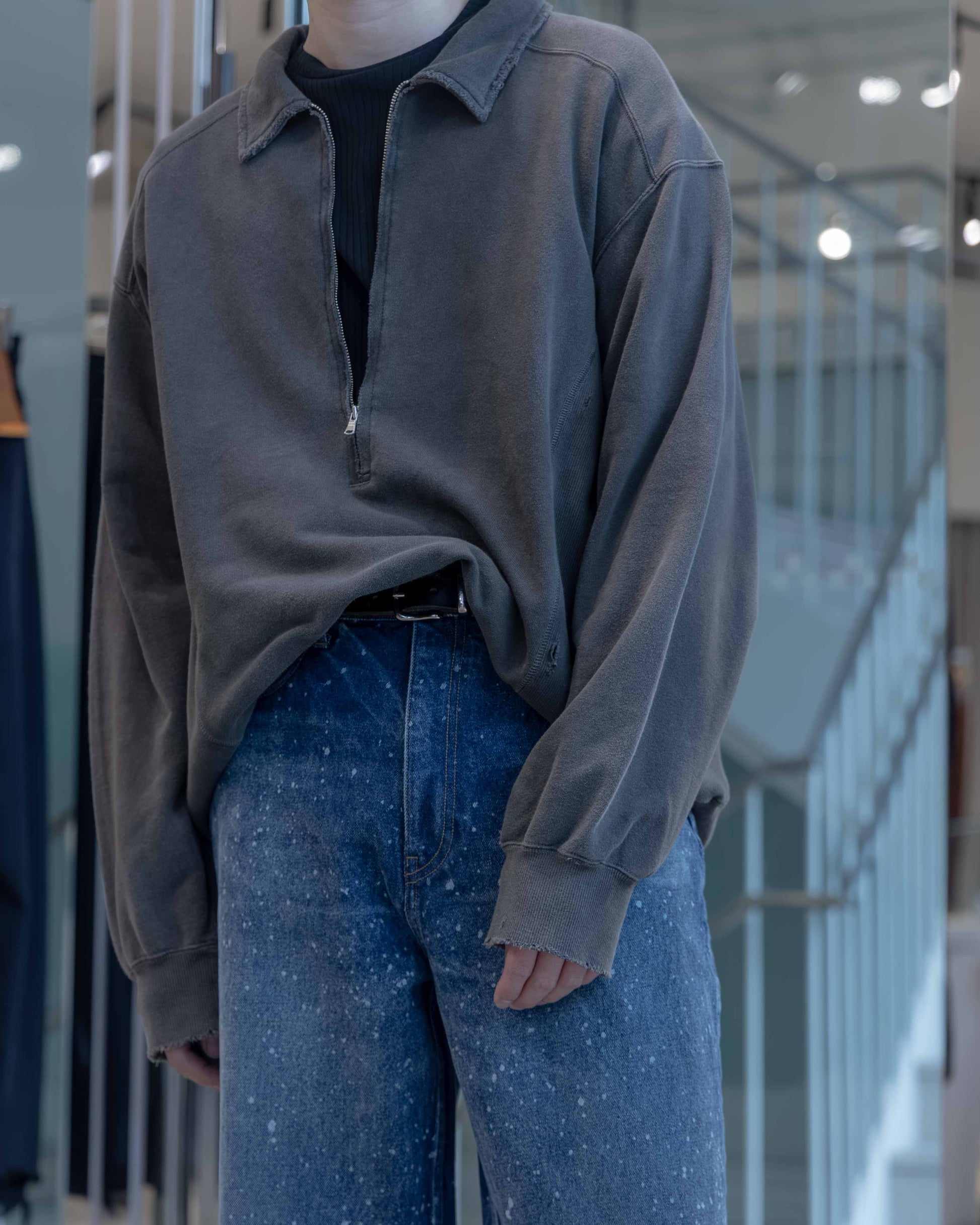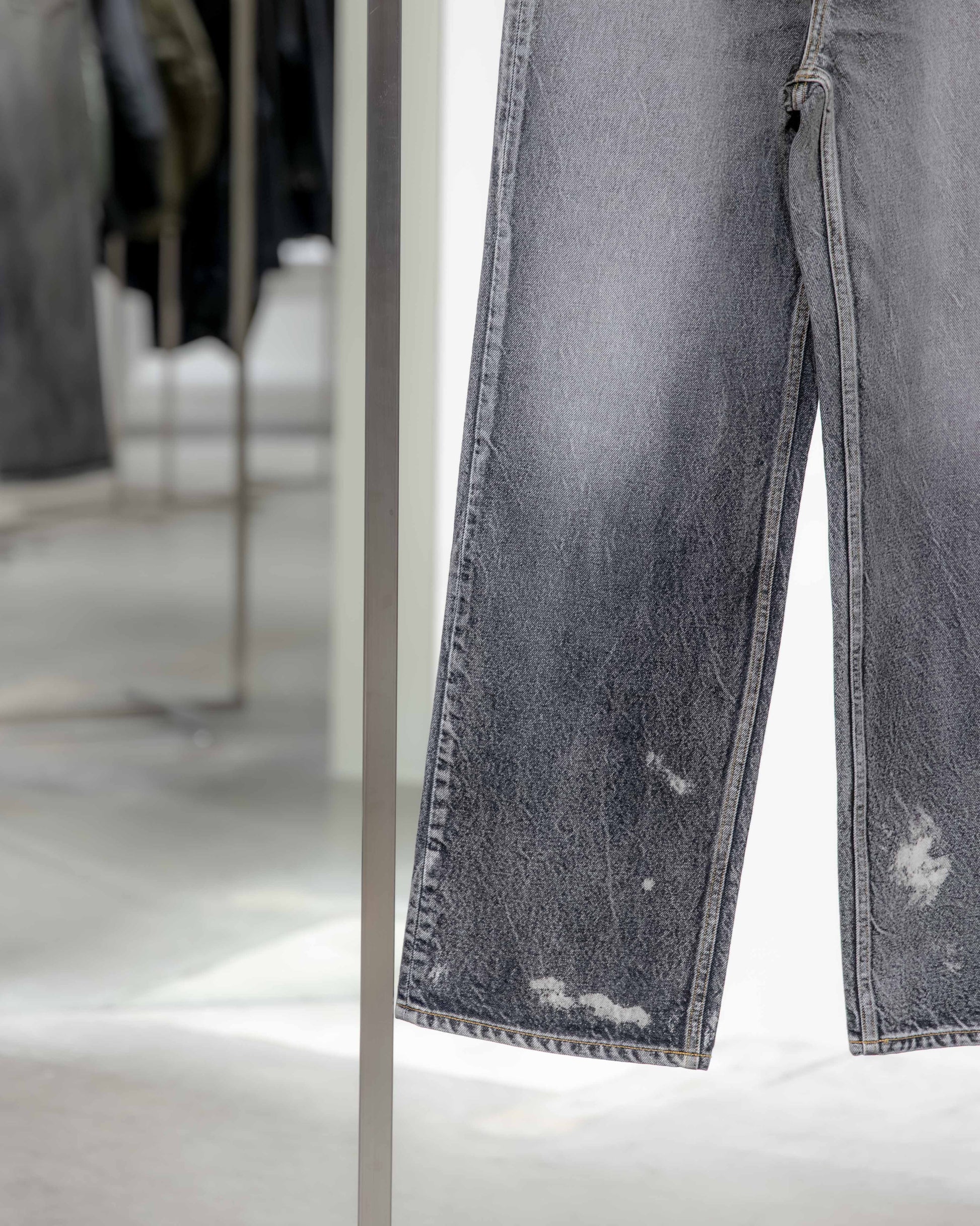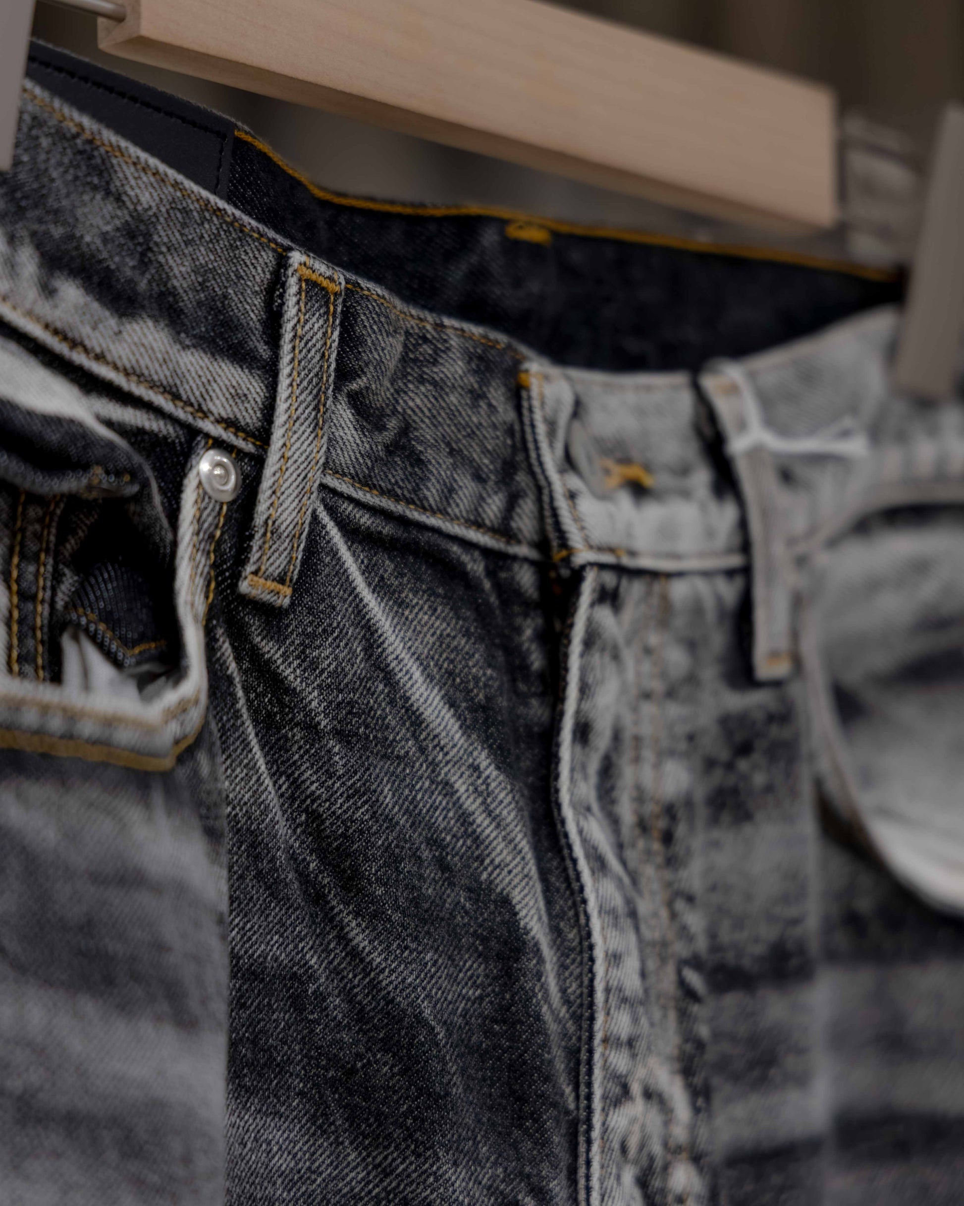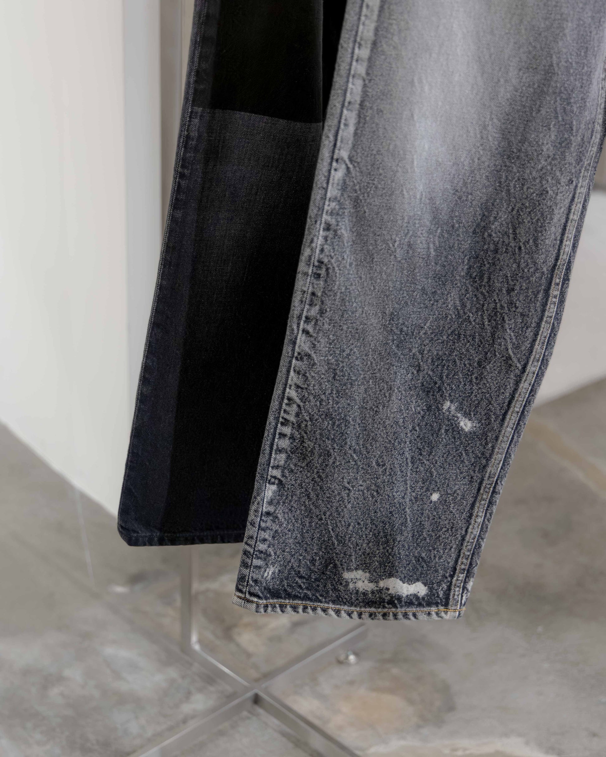 藍色款以經典丹寧藍為基底,透過特殊漂洗與潑染處理,營造出如細碎光點般的層次變化。表面呈現自然的刷痕與深淺不一的色澤,讓每件褲子的紋理都略有不同,像是長時間穿著後才會出現的獨特痕跡。