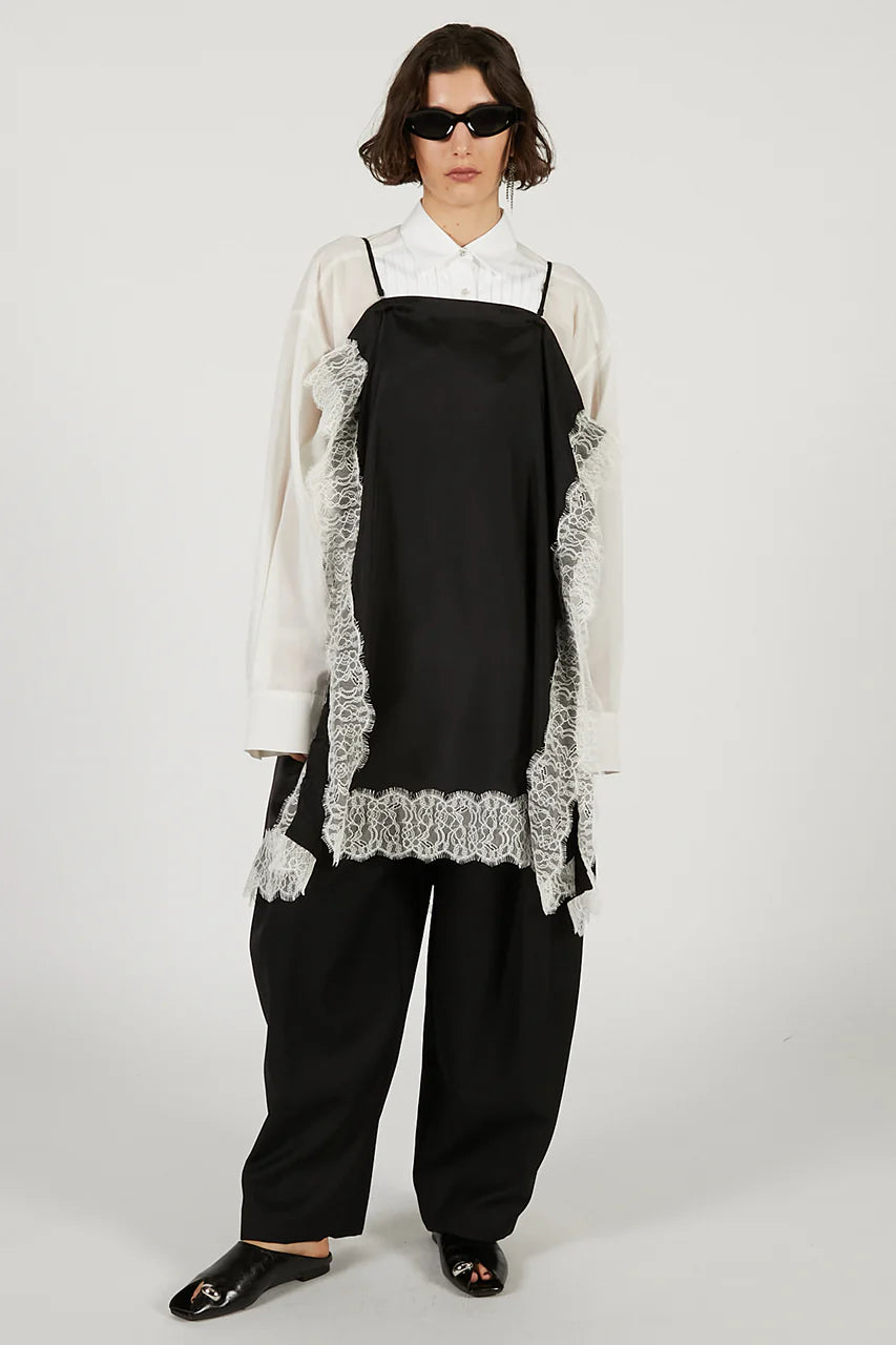 充滿實驗性的設計核心,僅由帶有精緻蕾絲飾邊的方形布塊巧妙構成,徹底打破了傳統剪裁的邏輯。