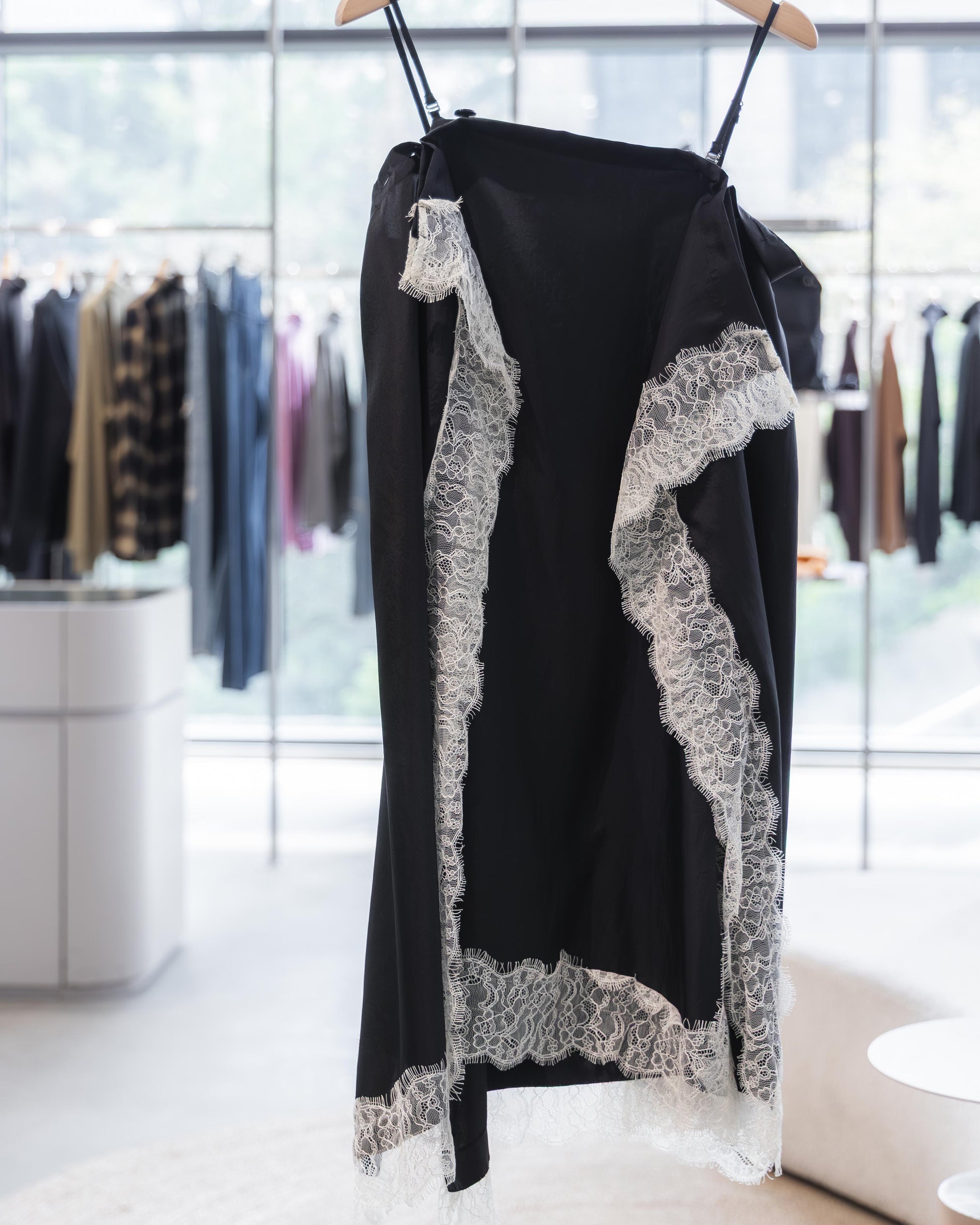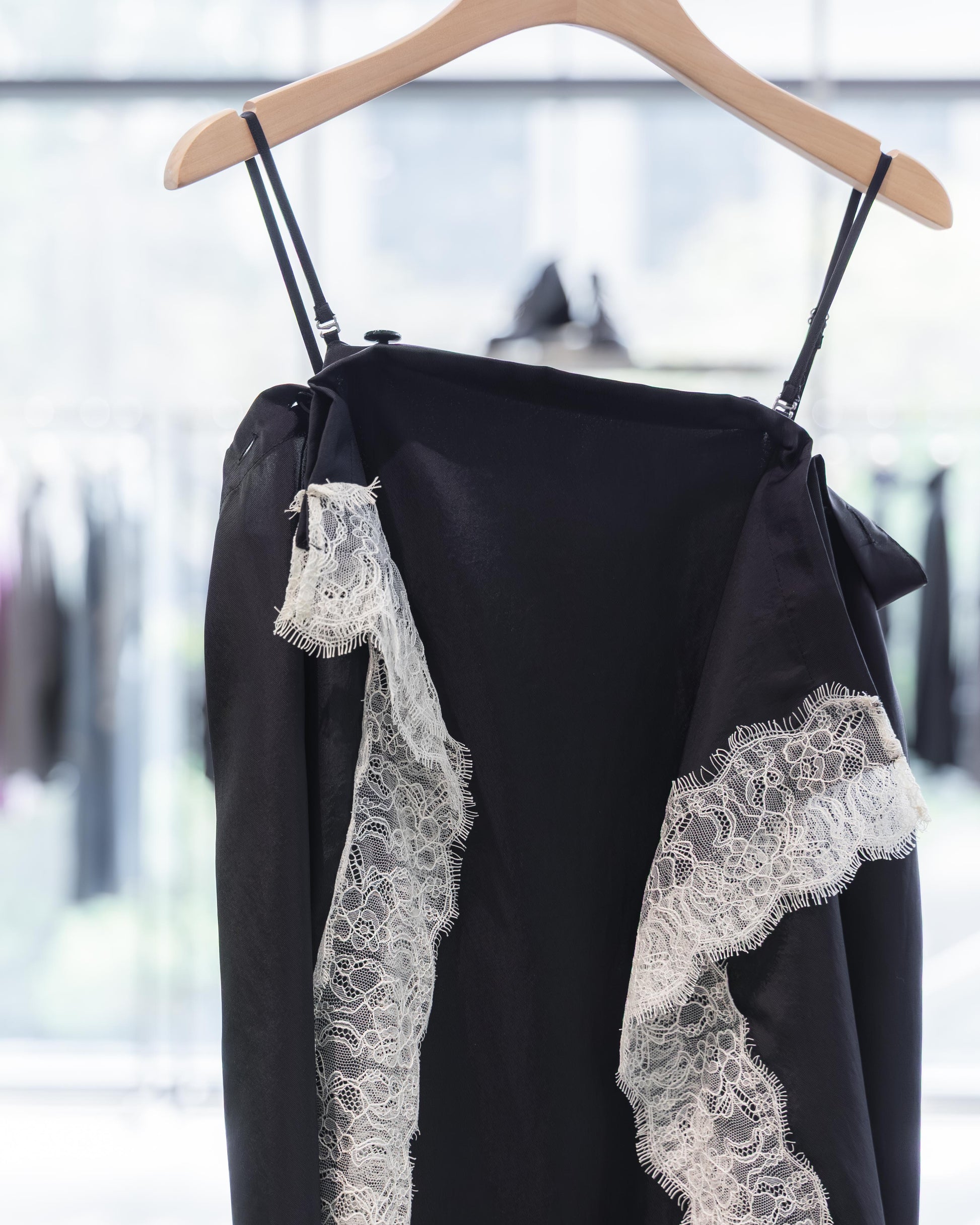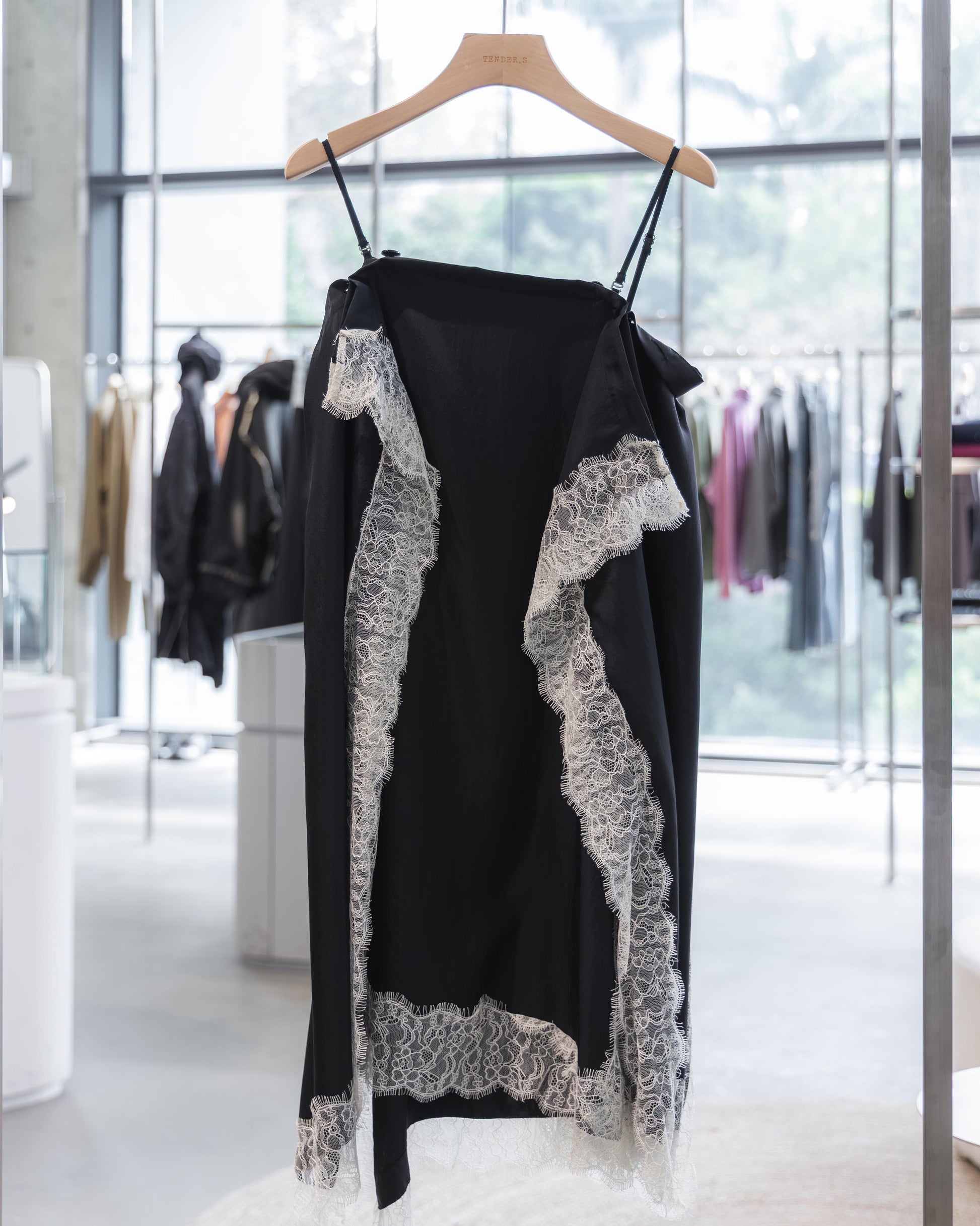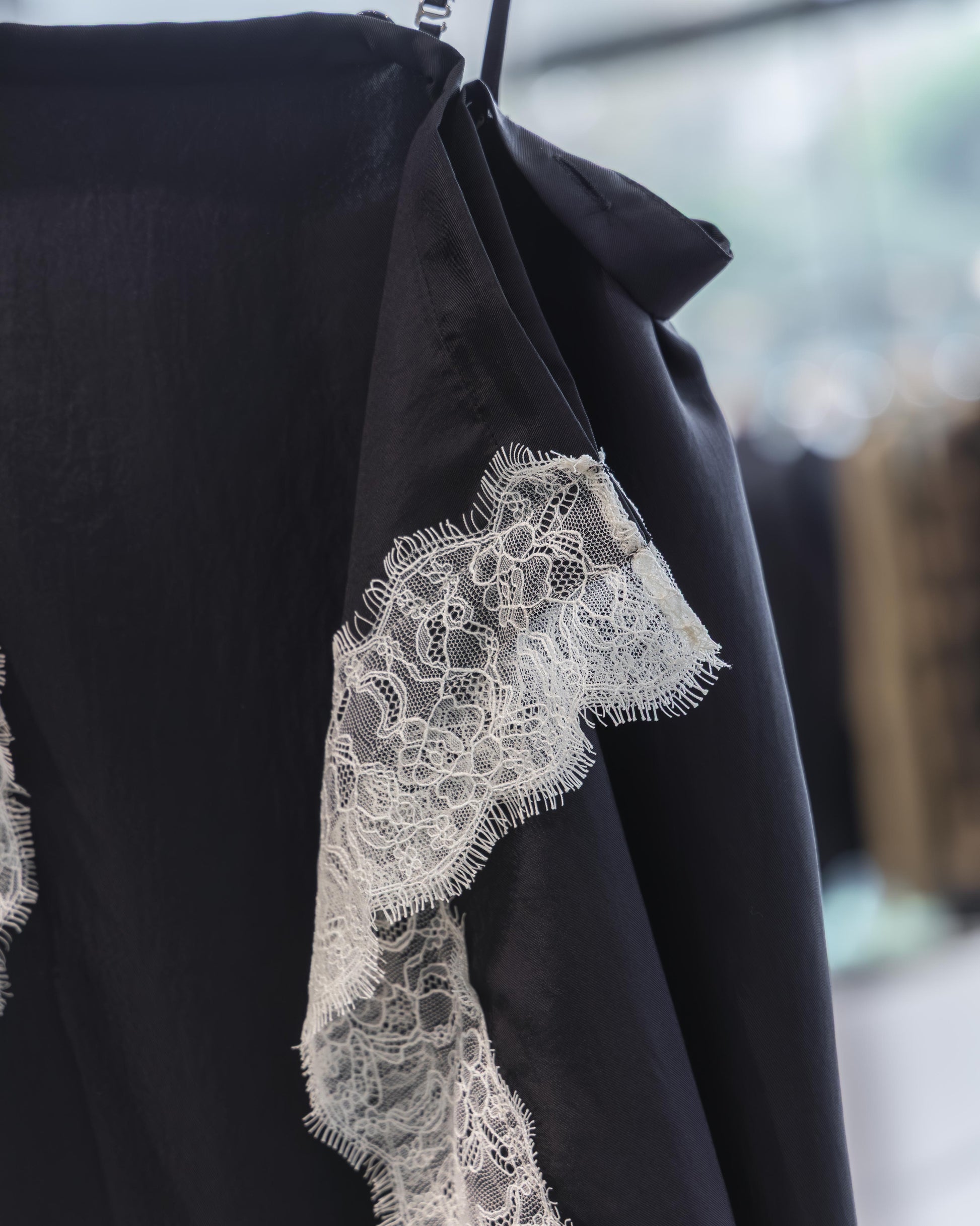 在全黑的基調下,布料交疊出的幾何線條反而更顯張力,讓蕾絲的細節在光影流轉間跳脫出來,散發出一種內斂卻極具存在感的設計氣場。