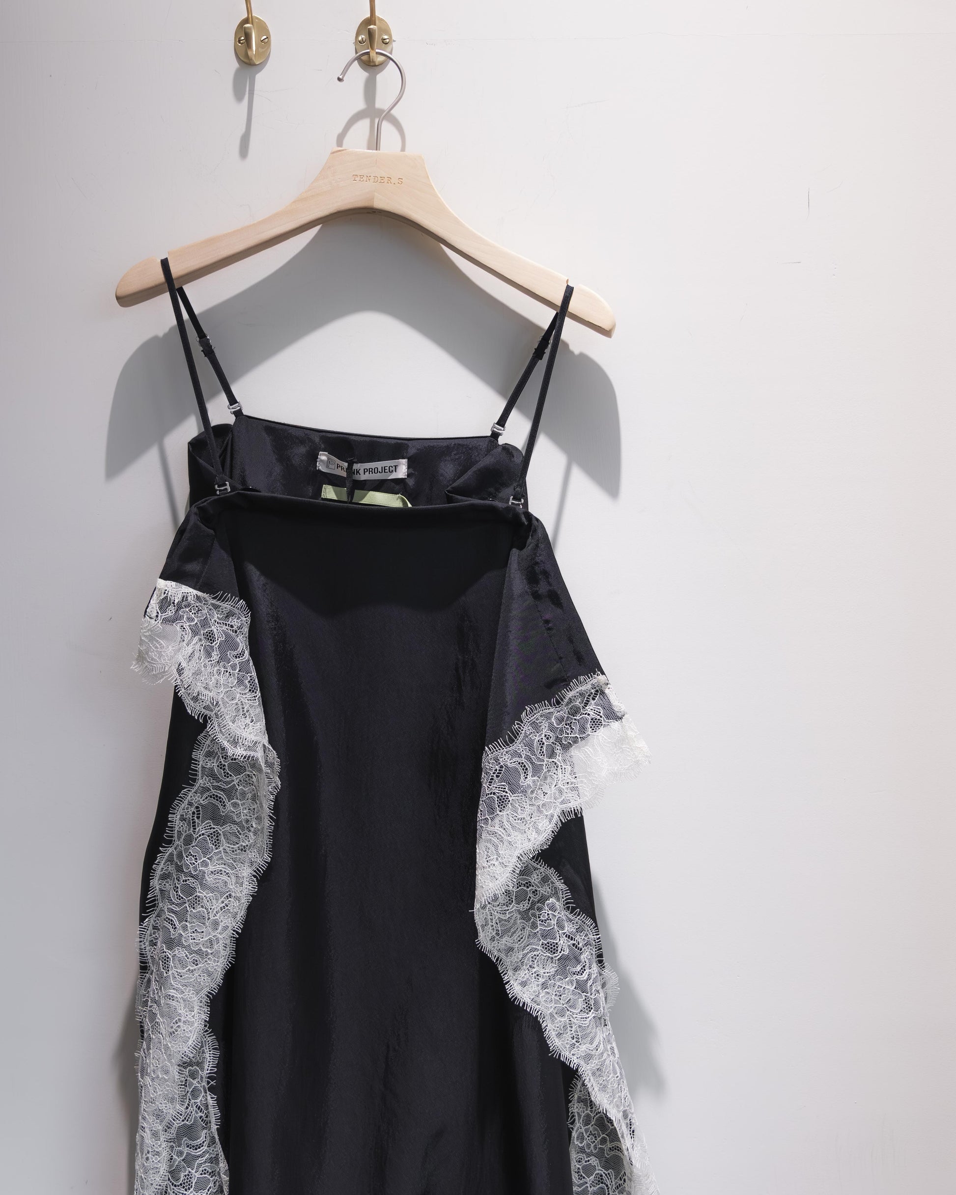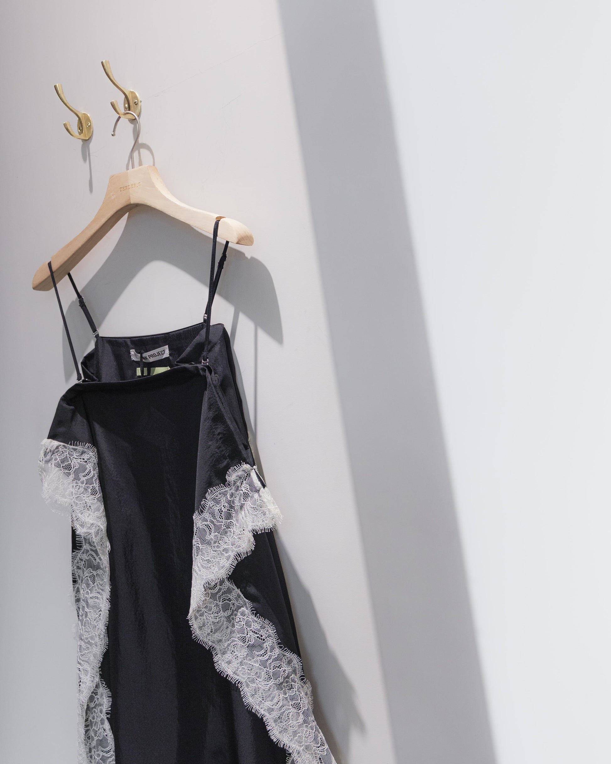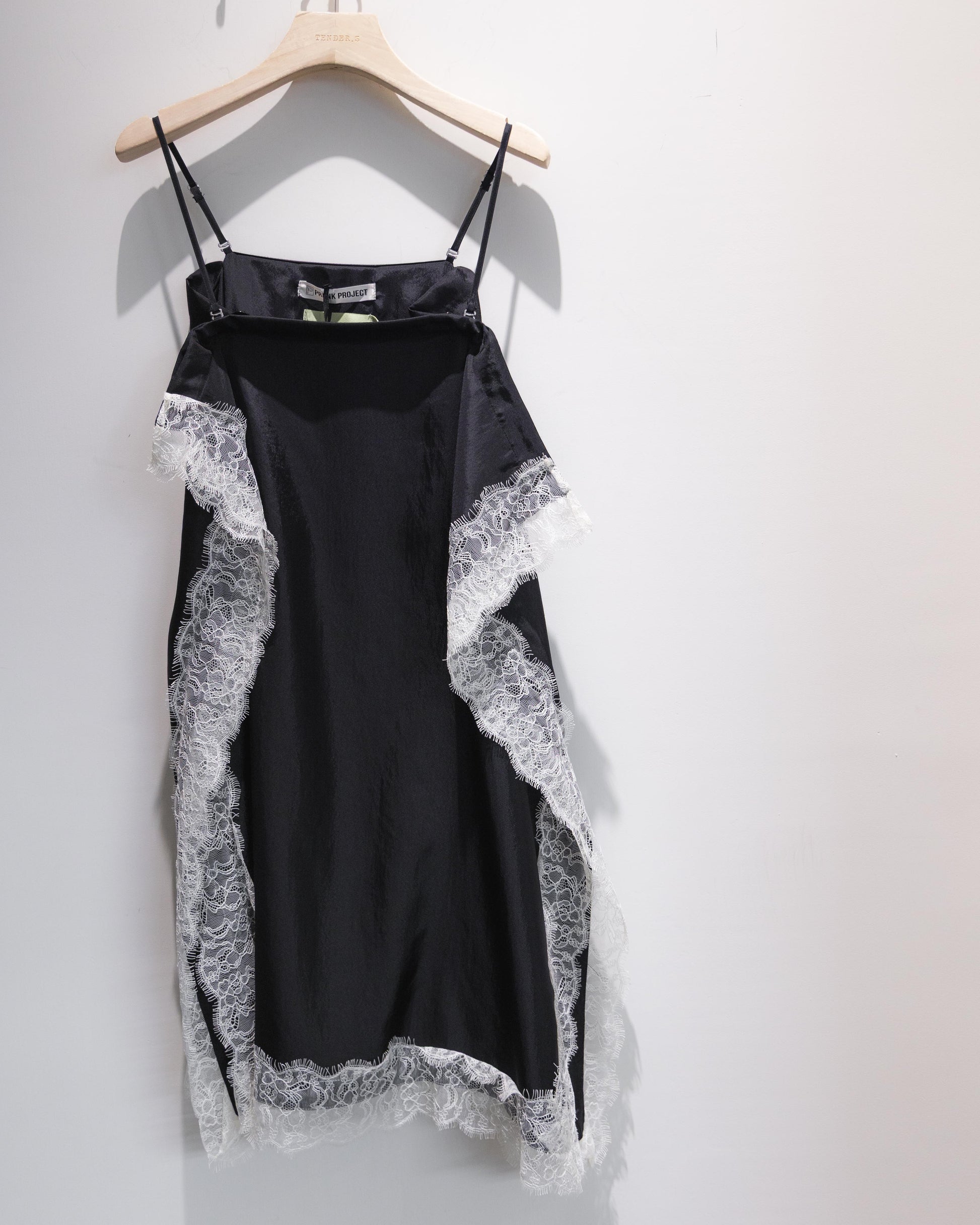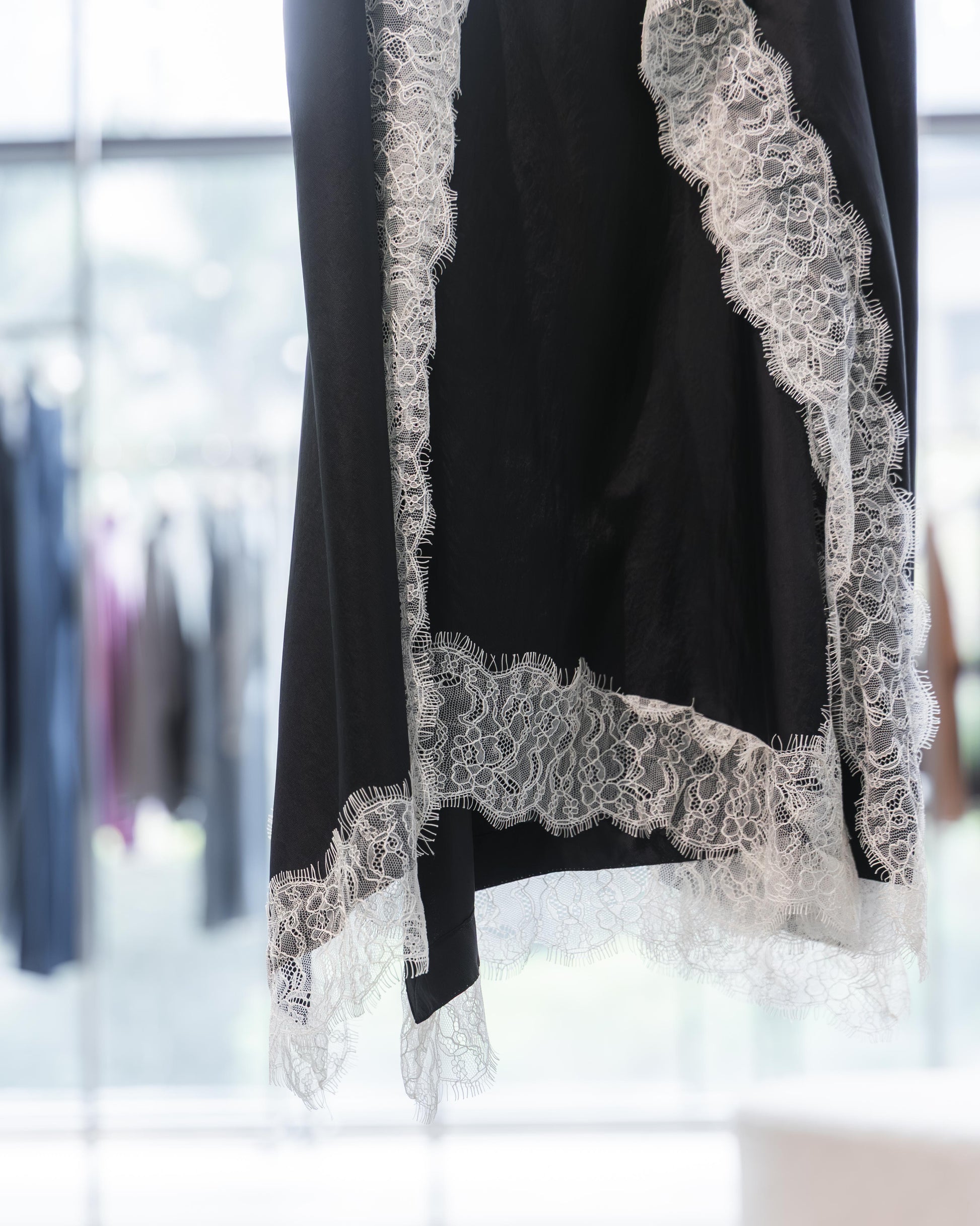 在全黑的基調下,布料交疊出的幾何線條反而更顯張力,讓蕾絲的細節在光影流轉間跳脫出來,散發出一種內斂卻極具存在感的設計氣場。