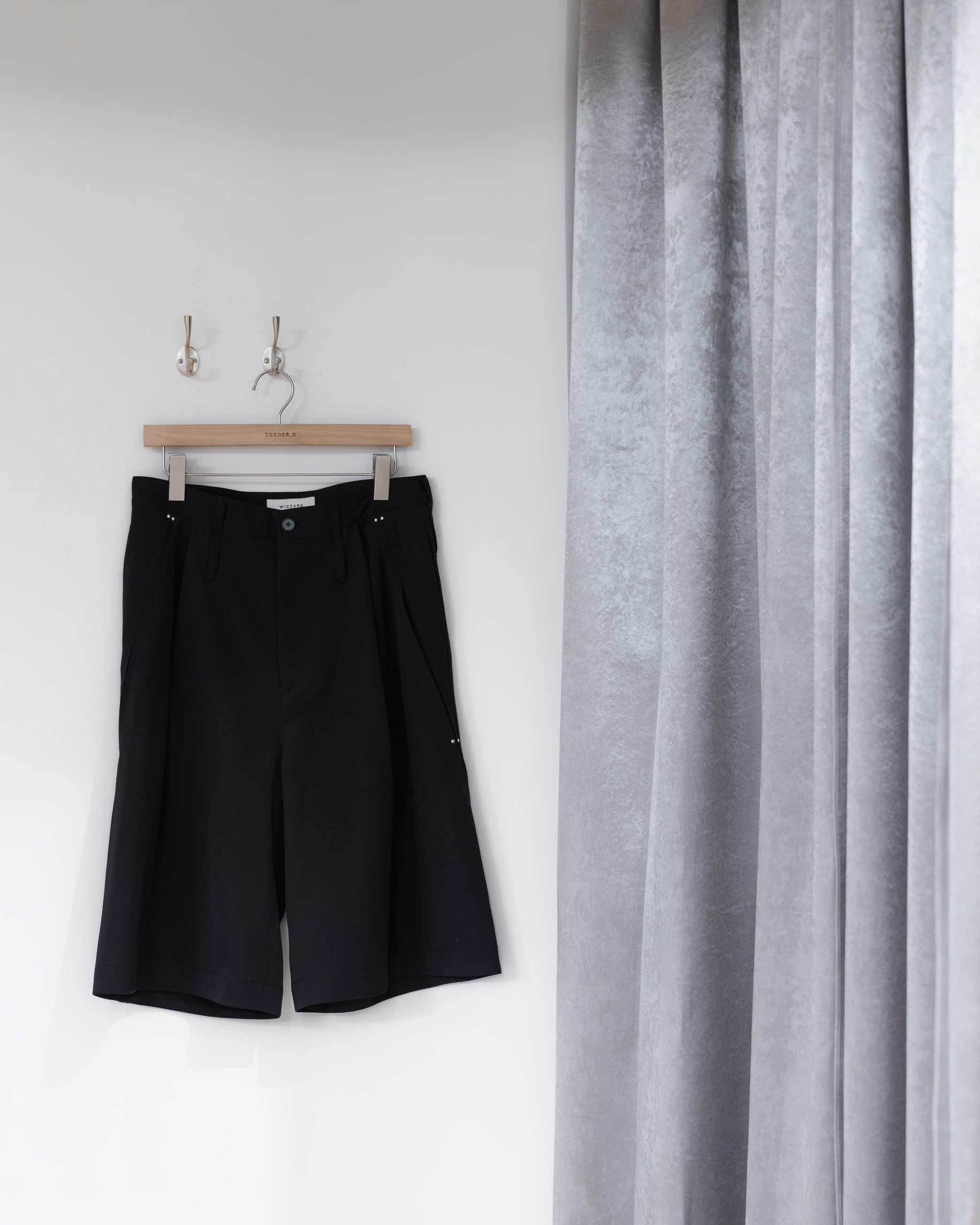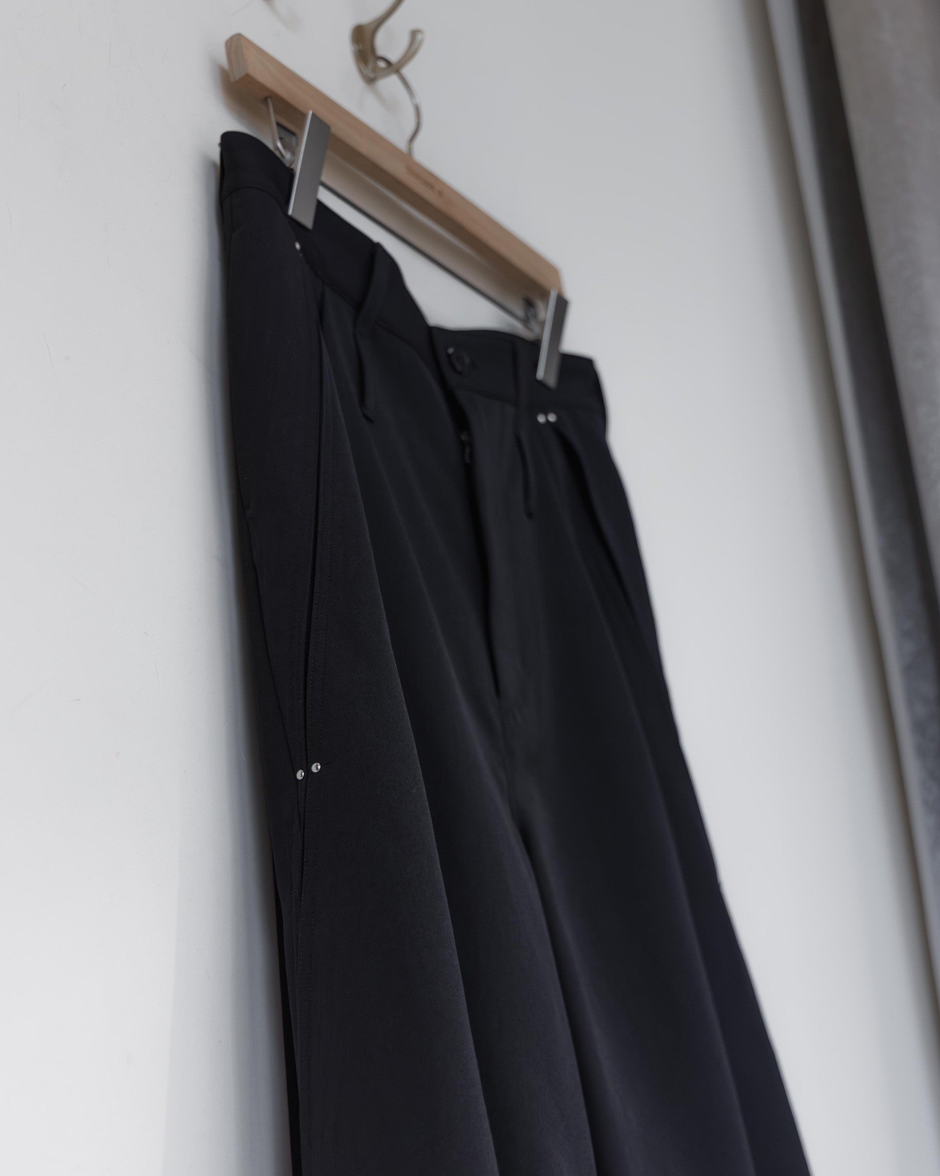 亮點藏在細節裡:側邊點綴的鉚釘增加了視覺層次,而倒褶結構則讓褲管隨著你的動作自然開合,讓原本簡約的寬褲在走路時多了種流動感。