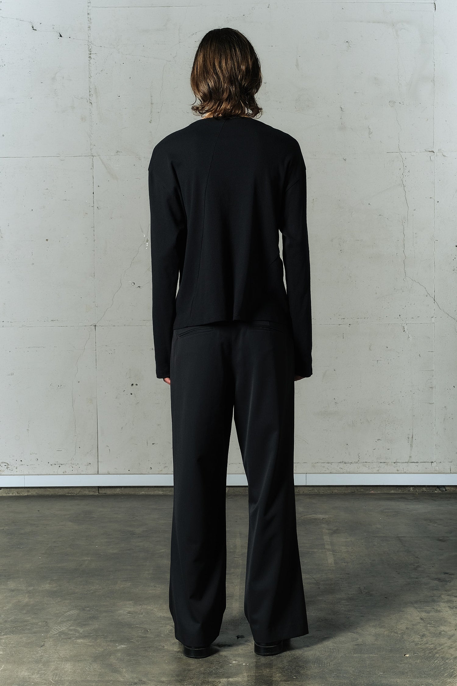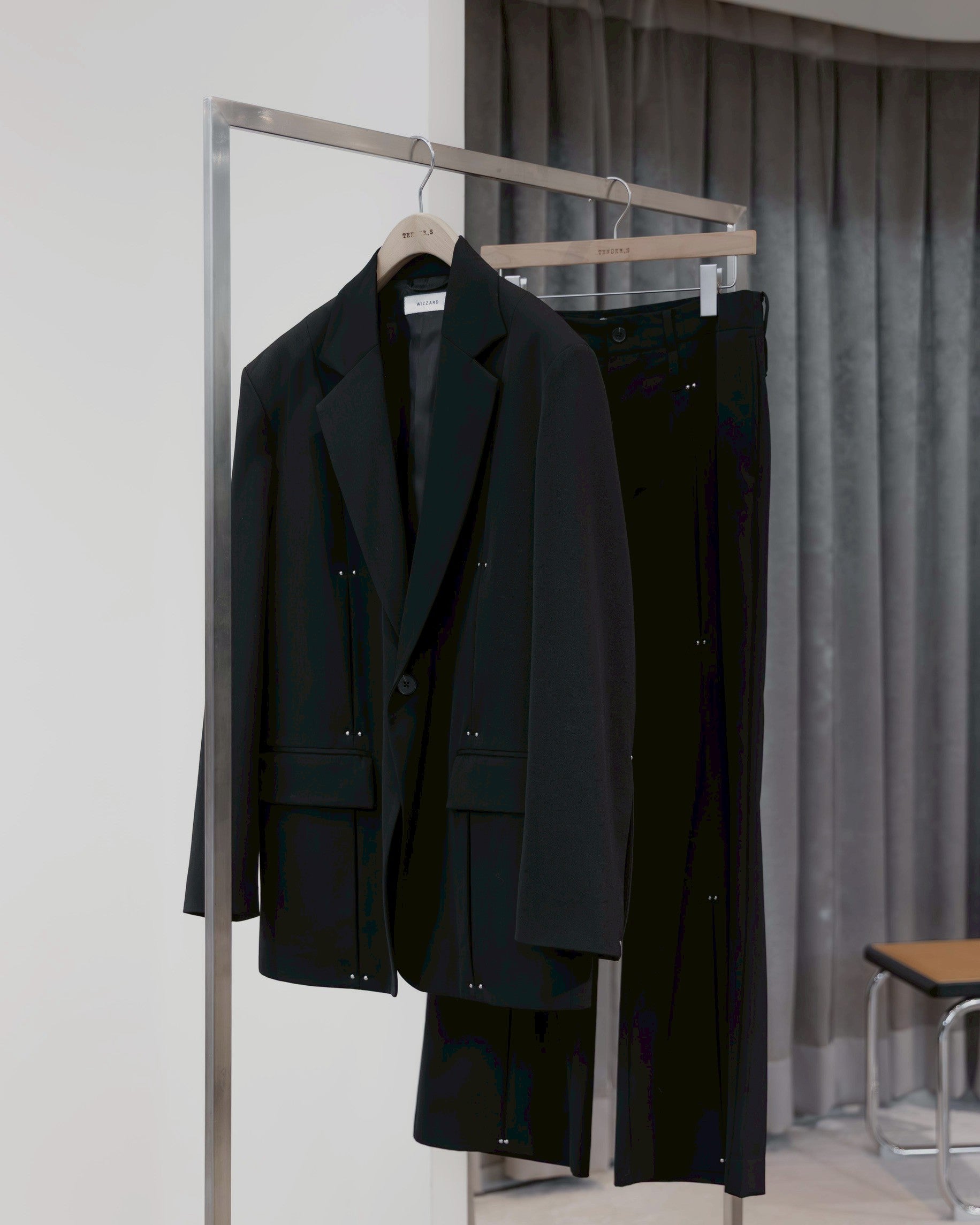 選用帶有特殊乾爽手感的機能羊毛混紡面料,將現代的隨性與經典的挺拔感平衡得恰到好處。這種面料不僅擁有優雅的垂墜感,更具備強韌、抗皺的特性,散發著內斂的洗鍊光澤。