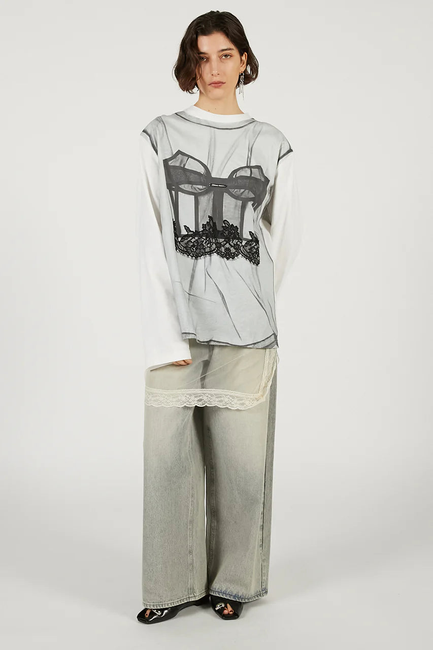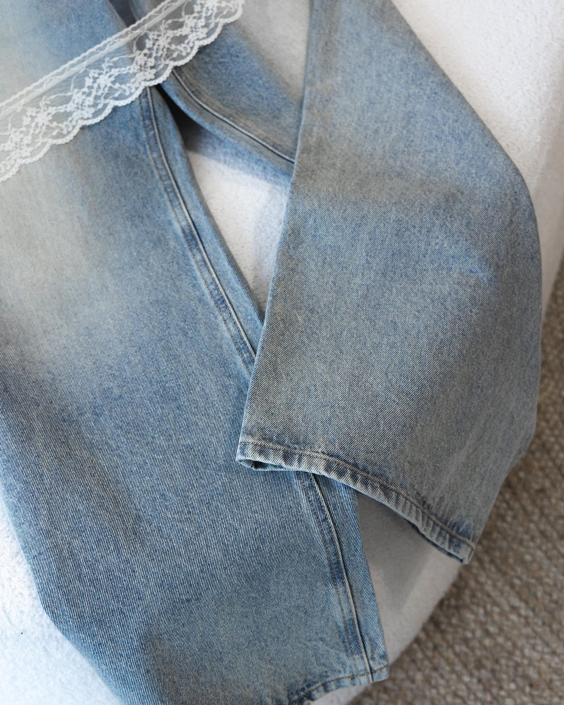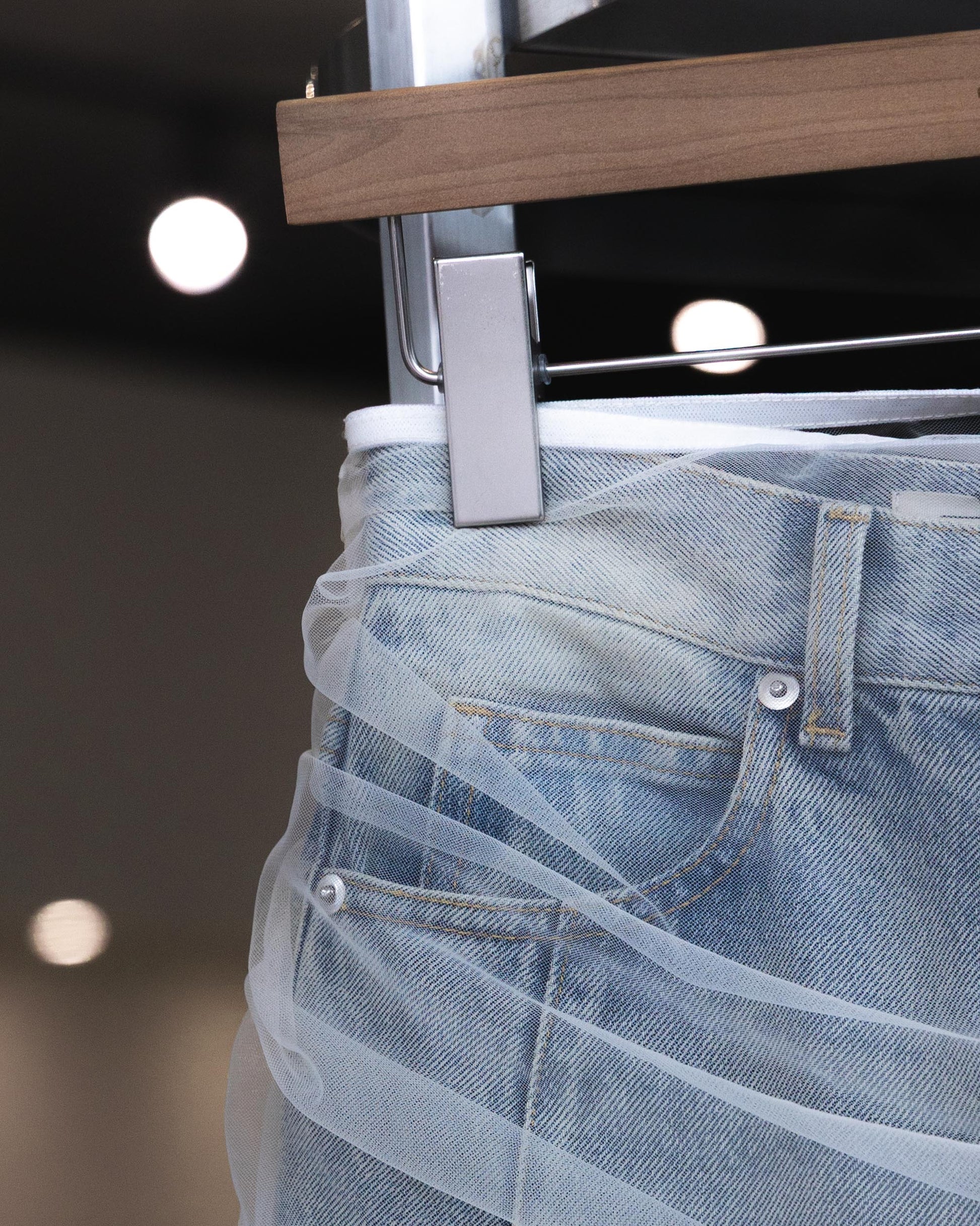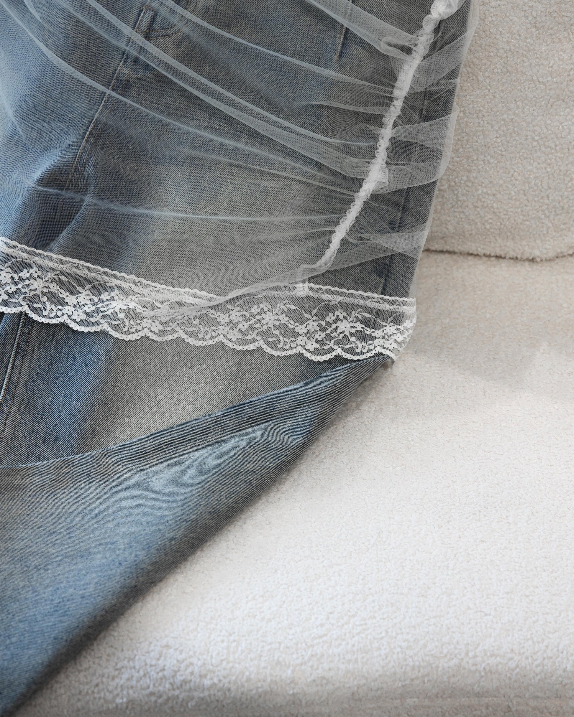 大膽挑戰了材質的既定印象,將丹寧的率性與紗網的柔美層層堆疊。透過 13.5 盎司純棉丹寧的紮實分量感,中和了輕盈透膚的仙氣,在剛與柔之間取得絕妙平衡。