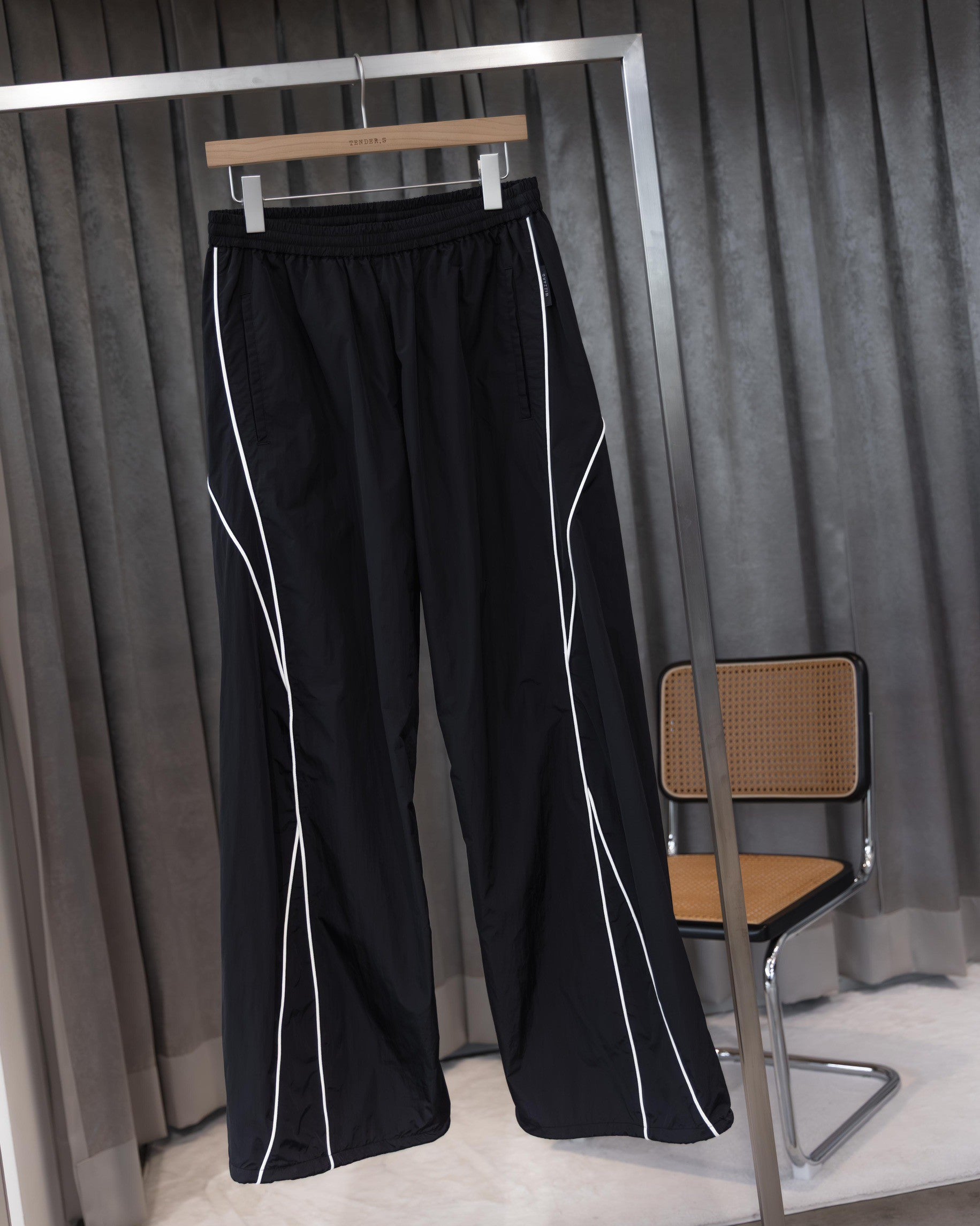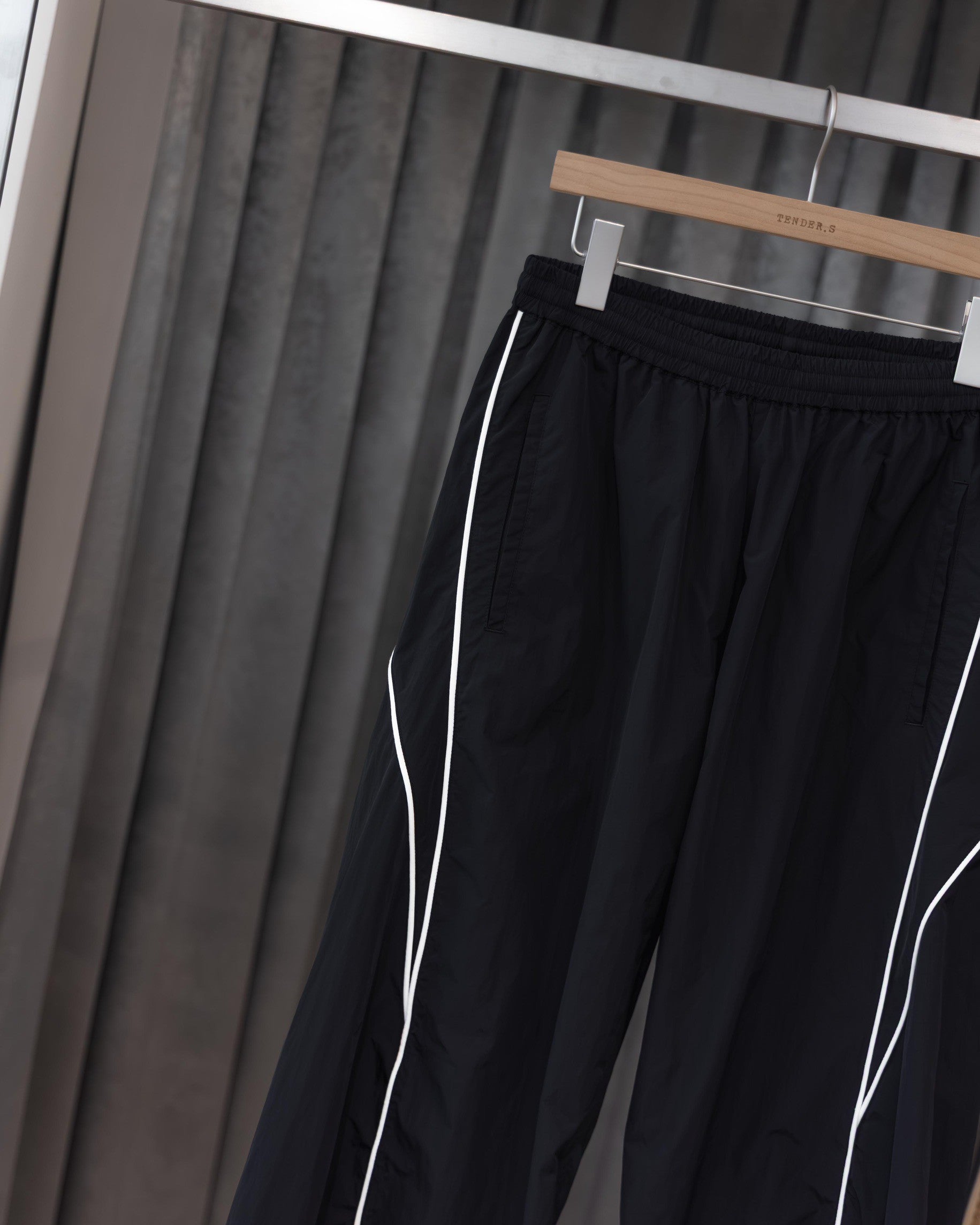 選用帶有細緻光澤的Micro-ripsto面料,透過立體剪裁工法打造出獨特的扭轉結構輪廓,讓褲管線條不再平庸,呈現出帶有流動感的美。